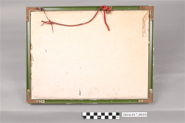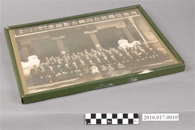 1.本物件為河南信陽旅臺同鄉合影留念,由物件正面可見相框材質為金屬、顏色為墨綠色。相框內放置1張黑白照片,照片上方可見「河南信陽旅臺同鄉合影留念 民國六十二年三月二十一日」字樣,照片為約莫4-5排穿著正式服裝的人士一同於大雄寶殿前合影,第1排為6位小朋友、第2排坐立於椅子、第3排以後則並肩站立階梯上。