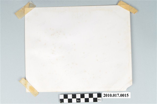 1.本物件為家族相片,由物件正面可見拍攝地點位於室內,共有5人入鏡,照片上另有黏貼1名男性頭像的黑白照片。該拍攝場景位於1張床鋪旁,一旁的櫃子上放置1臺收音機。物件中間可見5人合影,前有2名身著淺藍色、紅色上衣的孩童,中間為1名戴著圓框眼鏡的男性長者將雙手搭上淺藍色上衣的男童雙肩,該名長者的右方即放置1張男性頭像黑白照片。後方為1名身著白色襯衫的男性、1名身著白色外衣的女性。物件背面空白,可見三處黏貼痕跡。