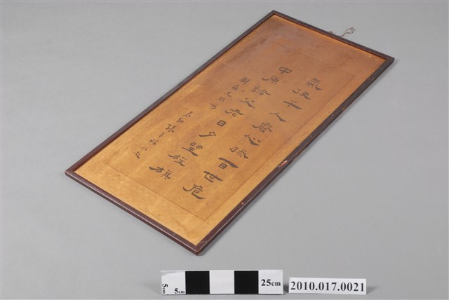 本物件為裝裱加框的書法作品,寫有「氣使千人廢心?百世危 中原諸父老日夕望旌旗」字樣,並註記「樹森兄雅囑」。物件本身有黃化的狀態,畫框有部分磨損。其中所提及的樹森兄應為臺南市市議員劉樹森先生。