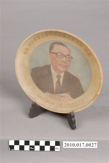 此物件為紀念盤,包含盤身與一附件(底座),盤面印有蔣經國肖像,邊緣打印「慶祝 蔣經國先生就任中華民國第六任總統」字樣。 蔣經國為蔣中正長子,於留俄求學期間曾加入蘇聯共產黨,並因國共關係惡化之故遭蘇俄當局質押下放。蔣經國於1937年回返中國,而後加入中國國民黨,主司政工、情治業務。蔣經國在1950年代主導了國民黨民間隨附組織如救國團、退輔會之運作,深刻涉入戰後黨國體制的形塑。1960年代,蔣經國歷任國防部、行政院首長,進而在1975年蔣中正逝世後接任中國國民黨主席並當選中華民國總統。蔣經國的行事作風穩健圓融,其在行政院長任內推動「革新保臺」政策,大事拔擢台籍青年菁英。在總統任內,蔣經國歷經了中美斷交與美麗島事件等局勢波動,他在此間壓抑了軍政系統的力量並確立技術官僚治國之發展基調。蔣經國於1987年宣布解嚴後的隔年病逝,終年77歲,總統職位由副總統李登輝繼任。 臺灣的總統選舉制度,依據中華民國憲法實施,憲法起草者張君勱參考了德國威瑪共和國憲法,在其基礎上加以調整以符合中國社會狀況。在選舉執行層面,原案雖設計為全民直選,因顧及當時中國國內文盲比例可觀,而改採縣級、省級和中央議會合組機關的間接選舉形式。在後續憲法修正過整中,國民黨內的CC派(Central Club)針對憲法上總統職權以及總統選舉制度提出修正,致使總統選舉改由國民大會間接表決執行,成為日後普遍行之的選舉模式。在臺灣社會,爭取總統直選的訴求可追溯至1970年代初期,雷震、許世楷等人均曾在不同的思路之下加以倡議;1980年代,則由當時在野的民進黨正式提出總統直選之訴求。最終直選訴求在1990年代為國民黨主流派所接受,臺灣社會在朝野共識下於1996年實施了首次的總統民選。1997年,臺灣被美國歷史最悠久的人權團體之一「自由之家」(Freedom House)評定為「完全自由國家」。(薛化元,2016:6-25)