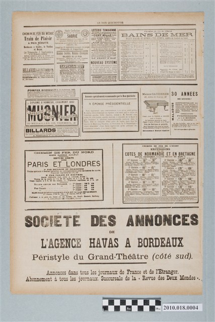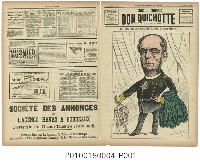 本物件為西元1884年9月5日刊行〈唐吉軻德畫報〉(Le Don Quichotte)的封面,描繪法國海軍中將庫爾貝(孤拔)。