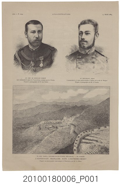 1. 本物件為刊登於1885年3月14日之法國《畫報》(L'Illustration)之180頁,左上角是法軍營長Dominé的肖像,右上角為Duboc中尉的肖像,底下為一幅描繪從基隆望去淡水城堡的鳥瞰圖。