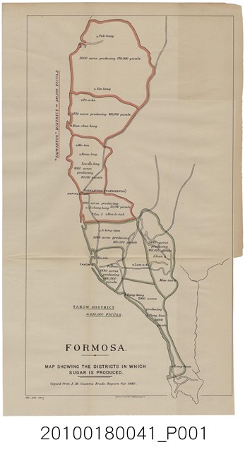 〈福爾摩沙糖產區圖〉(Formosa. Map showing the districts in which sugar is produced),根據1880年海關貿易報告複製,1891年由Harrison & Sons印行。