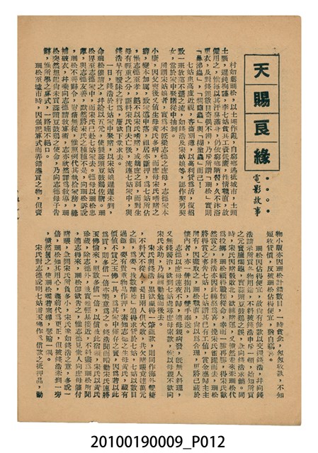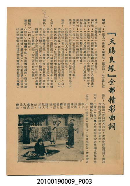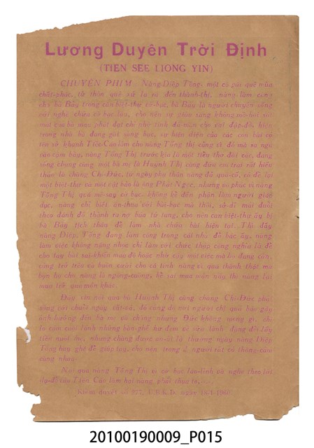 1. 香港電影《天賜良緣》於越南的戲院上映時的電影本事小冊。本事封面印有片名「天賜良緣」與「桃源公司出品風趣歌唱大喜劇」字樣,以及主演演員名單。本事背面為下期上映影片廣告,介紹另一部粵語片《魂化瑤台夜合花》,標明「芳艷芬又一舞台戲寶搬上銀幕」、「敬請注意映期」字樣,並於右側列出主演演員名單。本事內頁則收錄《天賜良緣》的電影故事、精彩曲詞、演員表等內容。2. 香港電影《天賜良緣》由桃源電影企業公司於1959年出品。由龍圖導演,芳豔芬、羅劍郎、李香琴、鄭君綿、白龍珠、馬笑英等領銜主演。桃源影業為1958年由李會桃創辦的香港電影公司,活躍於1950至60年代,曾出品《枇杷巷口故人來》(1959)、《獅吼記》(1959)等多部由龍圖導演、馮寶寶主演的各類型香港電影。