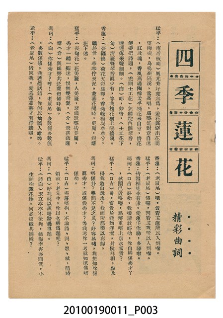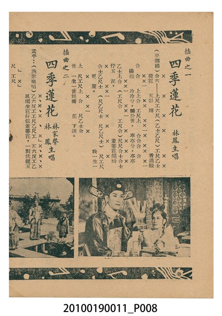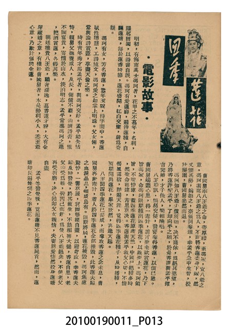 1. 香港電影《四季蓮花》於越南的戲院上映時的電影本事小冊。本事封面印有片名「四季蓮花」字樣。本事封底為下期上映影片廣告,介紹粵語戲曲電影《西施》,標明「全部歌唱愛國史劇」,並有「海洋影業公司輝煌代表傑作」、「珠光影業公司映權」等字樣,並列出主演演員任劍輝、白雪仙等人名單。本事內頁則收錄《四季蓮花》的電影故事、精彩曲詞與粵語片《戰國佳人》的電影廣告。2. 香港電影《四季蓮花》由邵氏兄弟影業公司於1960年出品。該片由周詩祿執導,林鳳、林家聲、半日安等領銜主演。邵氏兄弟影業公司的前身為拍攝粵語片的南洋影片公司,雖於1950年代更名為邵氏父子公司,以及1958年正式成立邵氏兄弟公司後,重心轉移至國語片,但仍有部分粵語片拍製與外銷至東南亞各地的業務。
