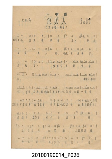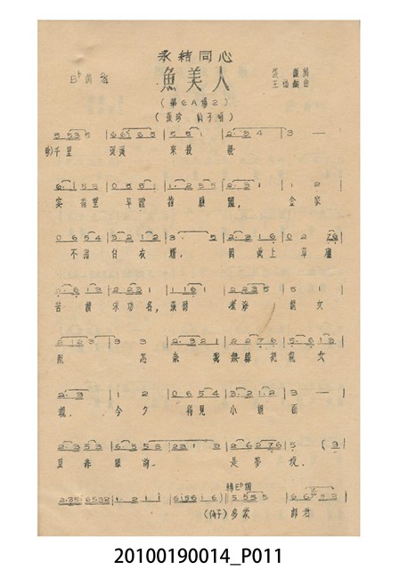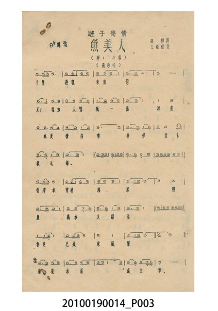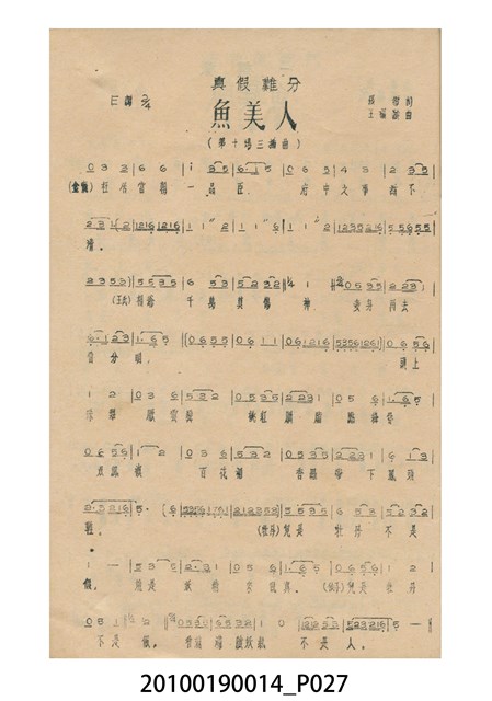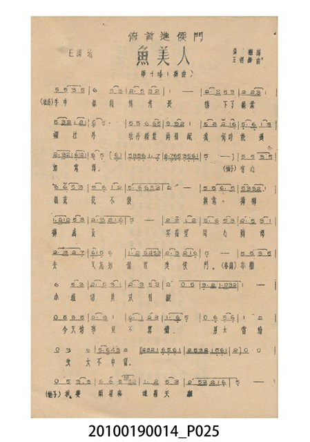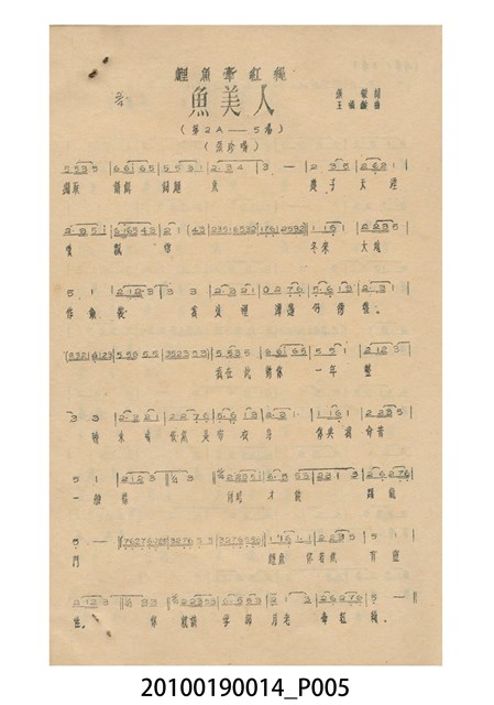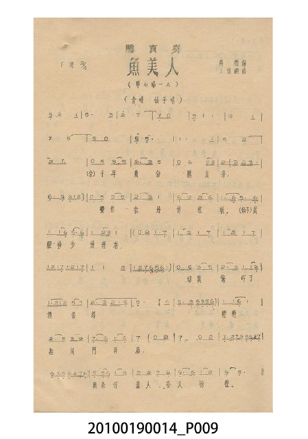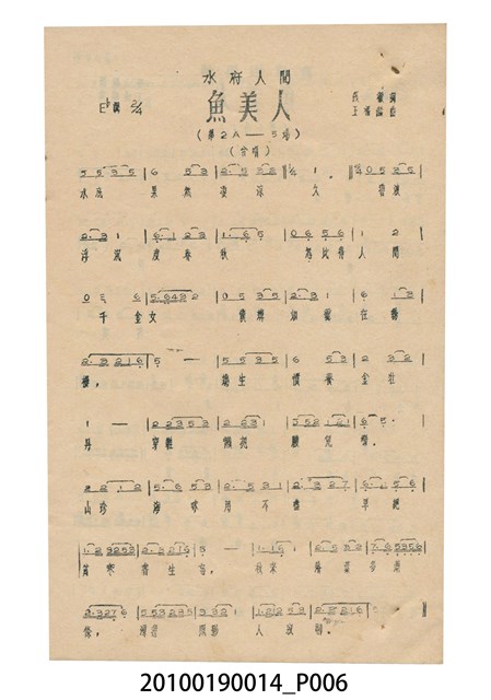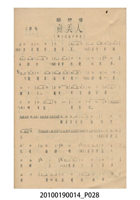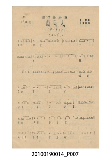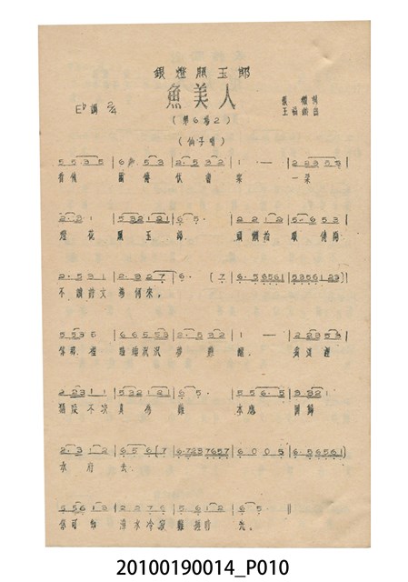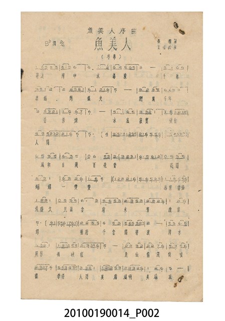 1. 香港國語片《魚美人》電影歌曲集,封面為片名「魚美人」為中心,以及標明「影后凌波最新傑作」、「電影原著錄音」字樣,封底則是素色,內頁為歌譜。2.《魚美人》為1965年由香港邵氏兄弟(香港)有限公司出品,高立執導、張徹編劇,凌波、李菁等聯合演出的黑白國語古裝電影,描述書生張珍思念指腹為婚的未婚妻牡丹,終日向魚池訴苦,鯉魚精同情張珍,化作牡丹與其戀愛的故事。