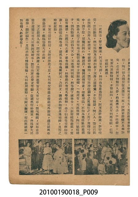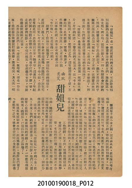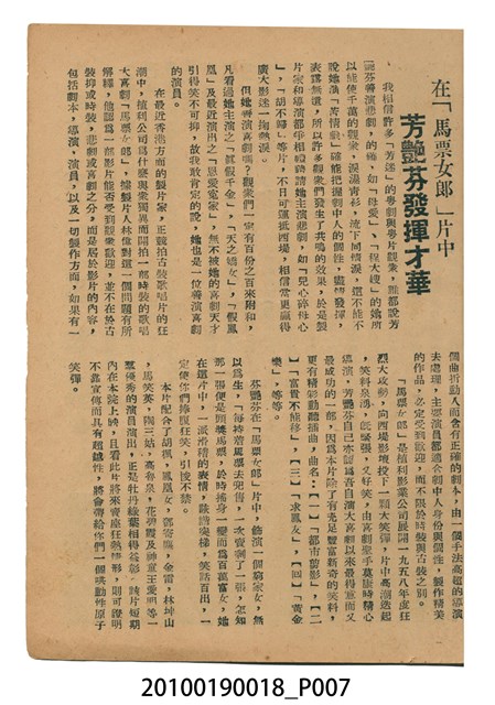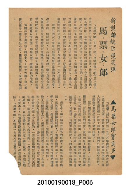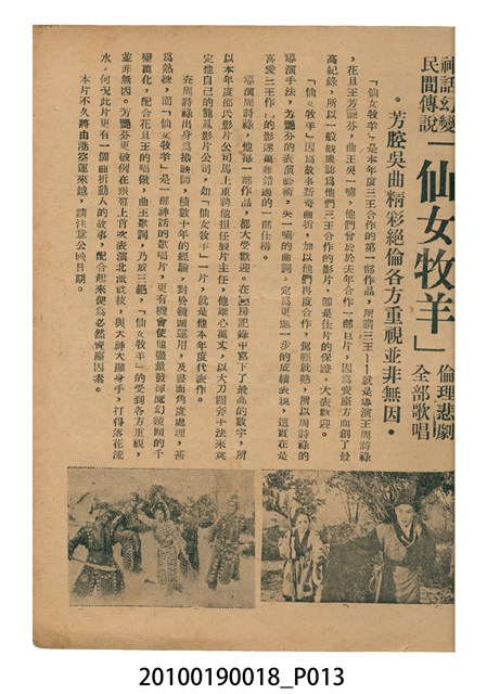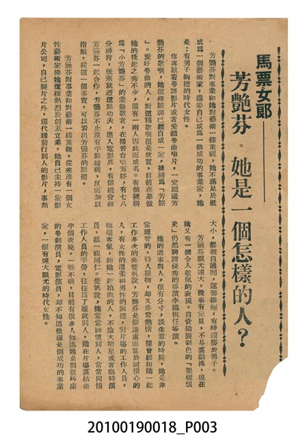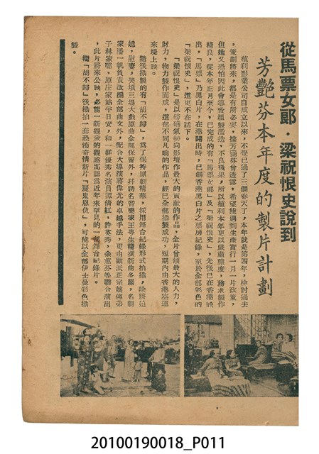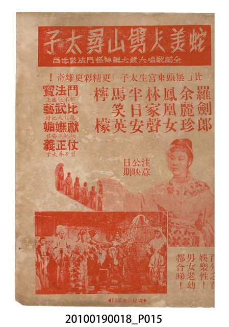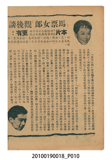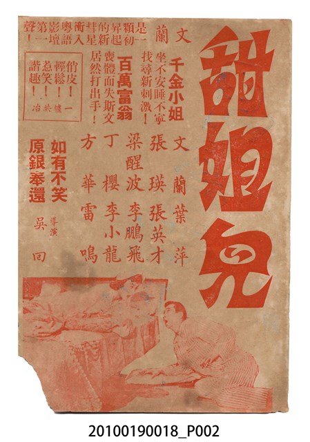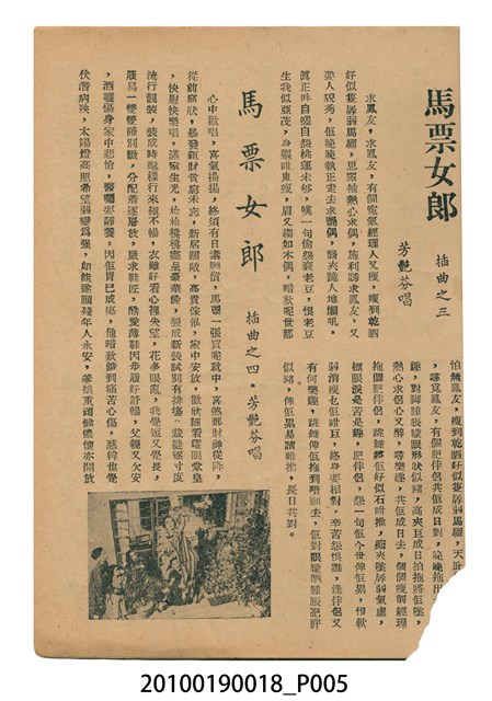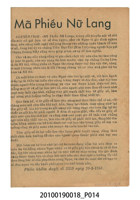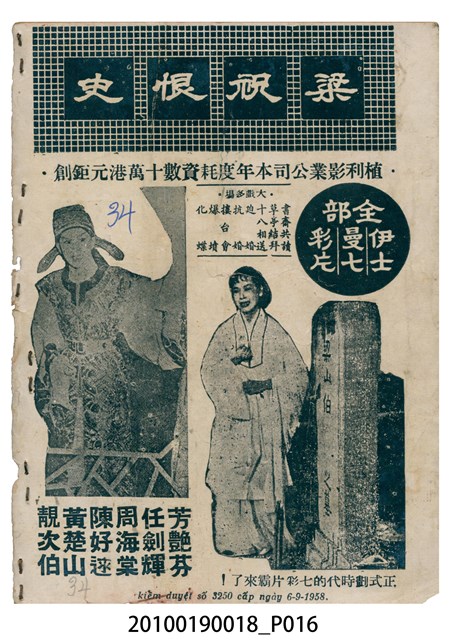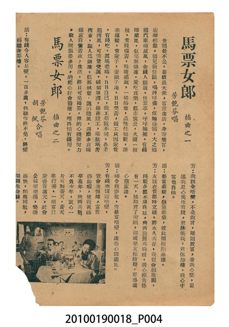 1. 香港粵語片《馬票女郎》等片宣傳小冊,封面是女主角芳艷芬人形劇照與5小張劇照,並標明片名、主演職員名,以及「一九五八年第一部王牌大喜劇」字樣。封底則是粵語電影《梁祝恨史》(1958)的全版電影廣告。內頁包括香港粵語片《甜姐兒》(1957)的電影廣告,《馬票女郎》的演員介紹、歌詞、電影本事等,以及粵語古裝片《蛇美人劈山尋太子》(1958)的全版廣告。2.《馬票女郎》為1958年由香港植利影業公司出品,莫康時執導,潘藩編劇,芳艷芬、胡楓、鳳凰女等聯合演出的黑白粵語喜劇電影,描述馬票女郎阿玉家境貧困,年幼弟妹也賣報紙、替人擦鞋貼補家計,某日阿玉中了馬票頭獎,一家人的生活有了轉變,也出現建築商要合作興建的喜劇故事。