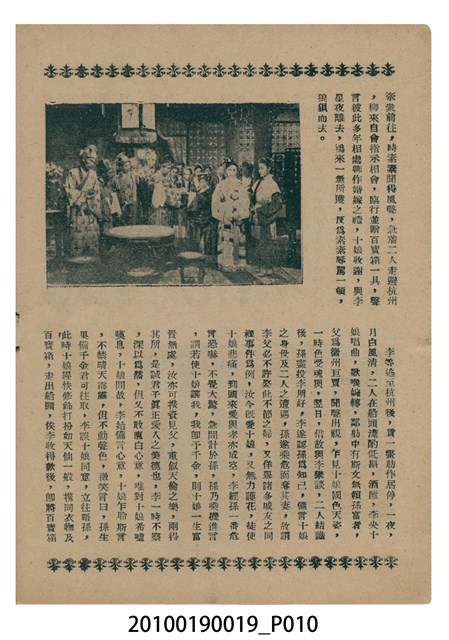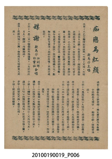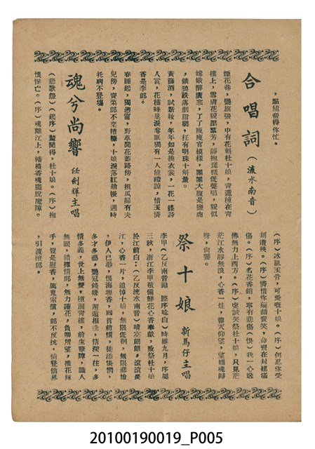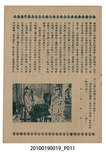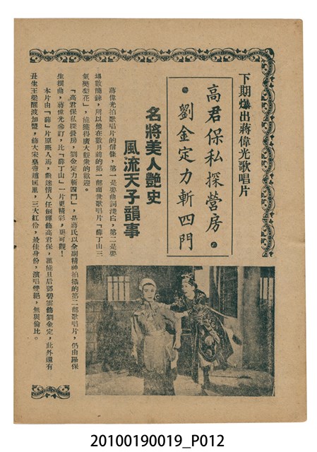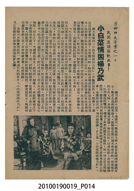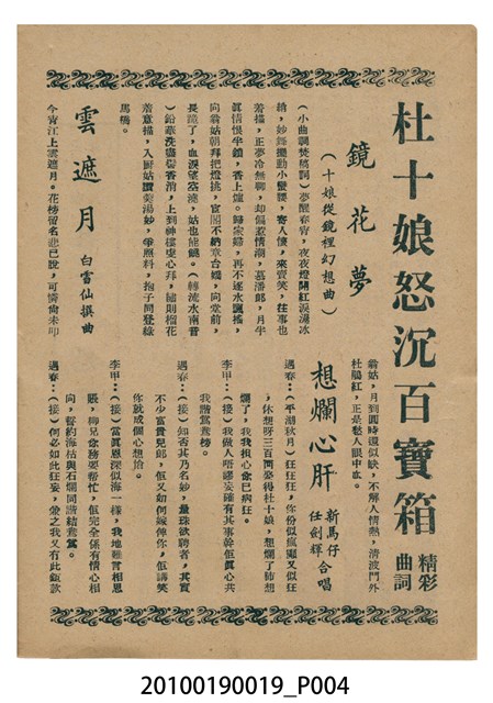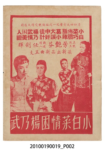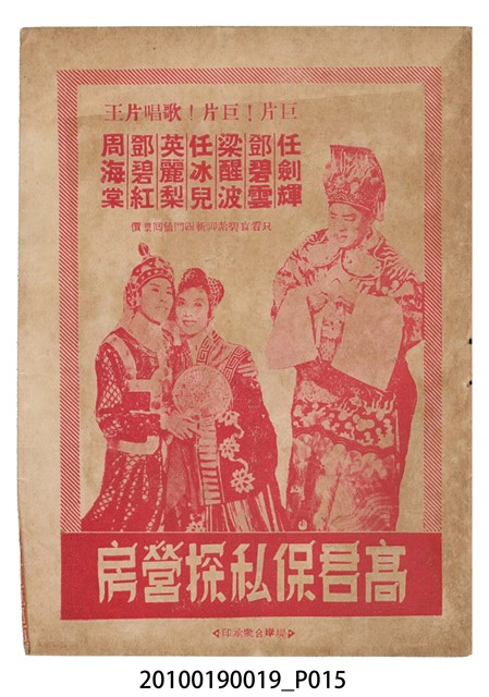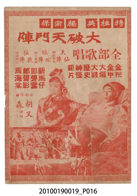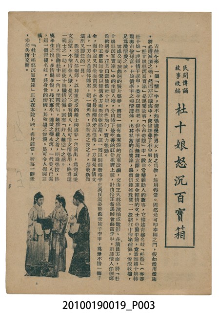 1. 香港電影《杜十娘怒沉百寶箱》於越南的戲院上映時的電影本事小冊。本事封面印有「杜十娘怒沉百寶箱」片名,以及「描述青樓女兒血淚愛情大悲劇」、「精撰名曲十支」等廣告文字與主演演員名單。本事封底為下期上映影片廣告,介紹粵語戲曲電影《穆桂英楊宗保大破天門陣》,標明「全部歌唱」、「金袍金甲大鑼大鼓歷史神怪鉅片」與「胡文森傑作」等廣告字樣,並列出主演演員名單。本事內頁則有《杜十娘怒沉百寶箱》的電影介紹、劇照、主演演員的介紹、精彩曲詞,以及即將上映的電影《小白菜情困楊乃武》、《紅顏浩劫》、《高君保私探營房》的電影廣告。2. 香港電影《杜十娘怒沉百寶箱》由雲峰影片公司逾1956年出品,王天林執導,馮夢龍原著,馮一葦編劇、陸雲峰監製,白雪仙、新馬師曾、李寶瑩、林妹妹、李鵬飛等主演。王天林(1927-2010)乃生於上海的香港電影導演、演員、電視劇監製,曾執導多齣以六十年代初港滬文化衝突為題材的南北喜劇系列,也曾執導多部廈語片和潮語片。