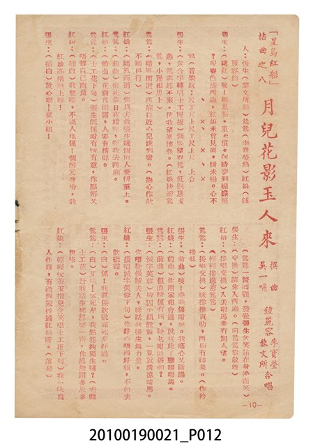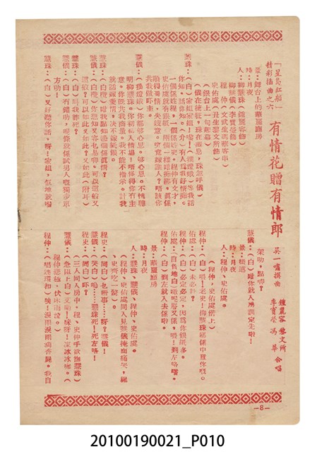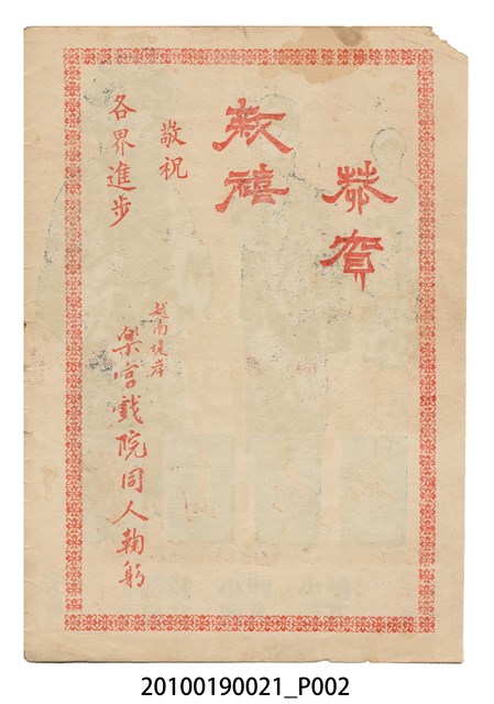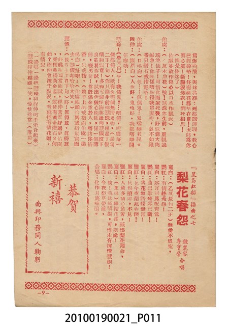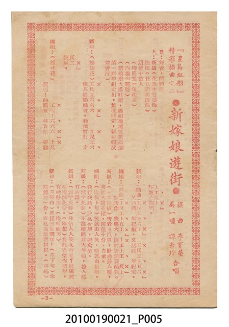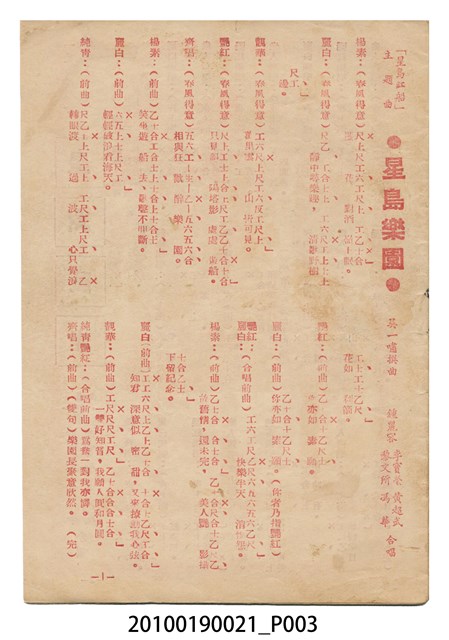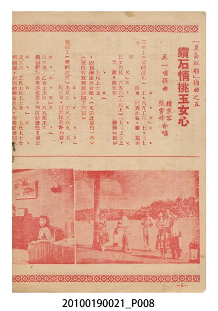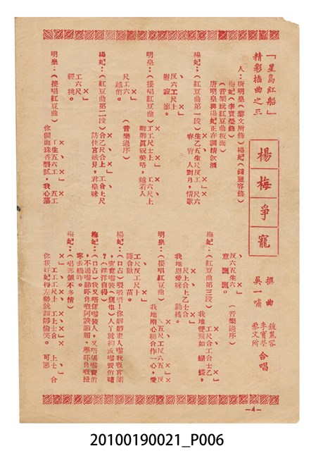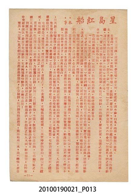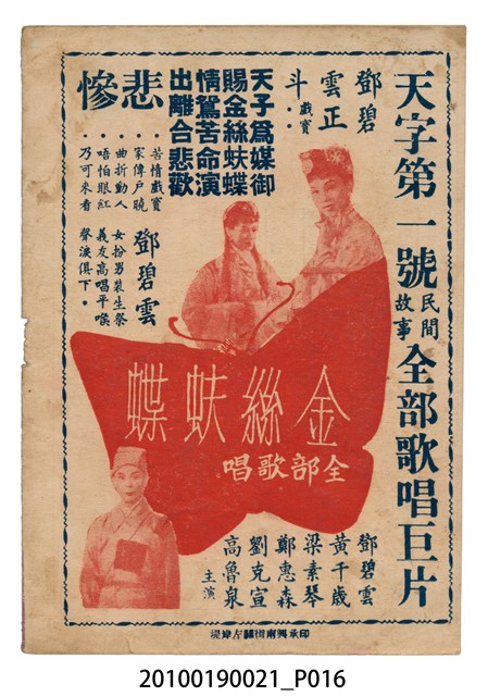 1. 香港粵語片《星島紅船》等片宣傳小冊,封面是戲中戲《西廂記》的鍾麗蓉、李寶瑩和黎文所三人的人形劇照,並標明片名,以及「名曲十支」、「藝壇三寶 新紅線女・小何非凡・小芳艷芳 領銜主演」、「大戲三場」字樣,封底則是粵語電影《金絲蝴蝶》(1955)的全版電影廣告。內頁包括越南提案樂宮戲院新年廣告、《星島紅船》的歌詞、電影本事、演員表,以及香港粵語片《白蛇傳》(1955)的全版廣告。2.《星島紅船》為1955年由邵氏父子有限公司出品,顧文宗執導,李寶瑩、鍾麗蓉、黎文所等聯合演出的黑白粵語電影,描述名伶英麗白和兄、妹到星洲獻藝,獲馬三水垂青,導致其情婦杜七姑妒火中燒,遂命人中傷並禁錮英麗白,並阻其參加義演,所幸英麗白的愛人楊素及時將她救出。