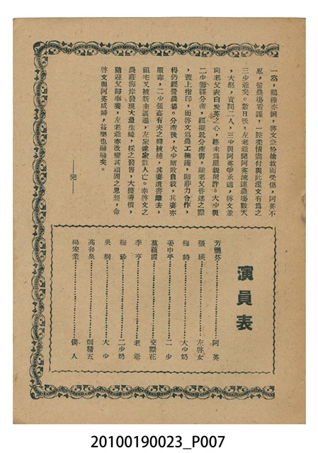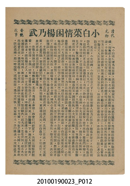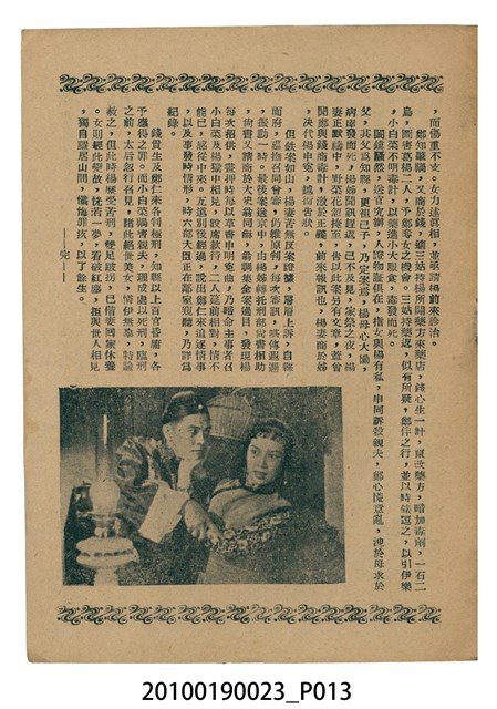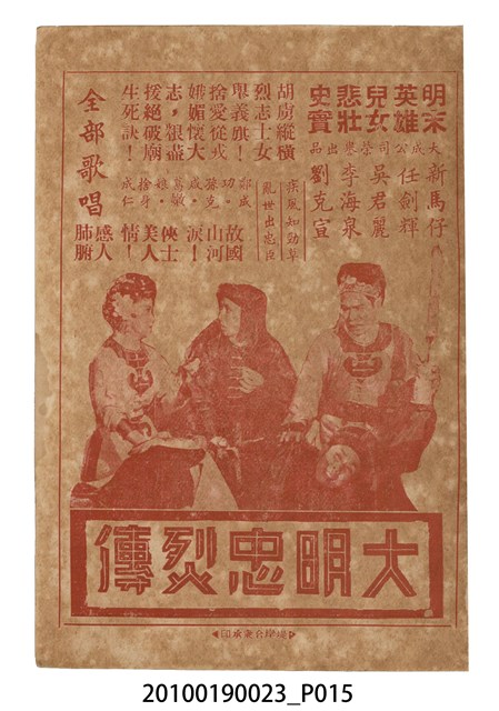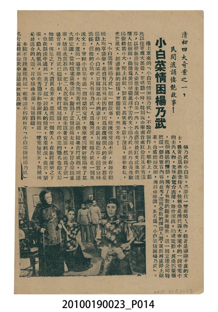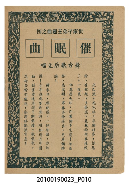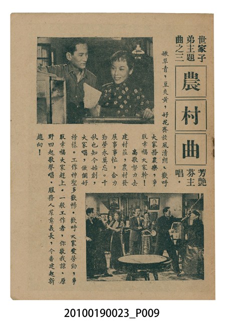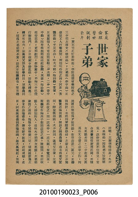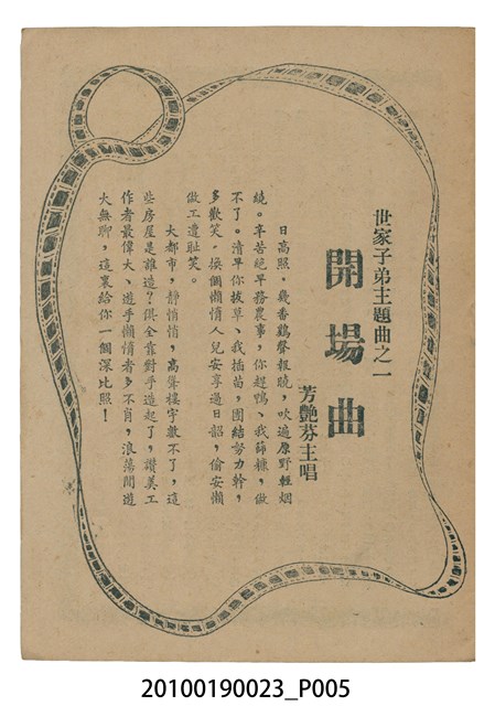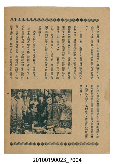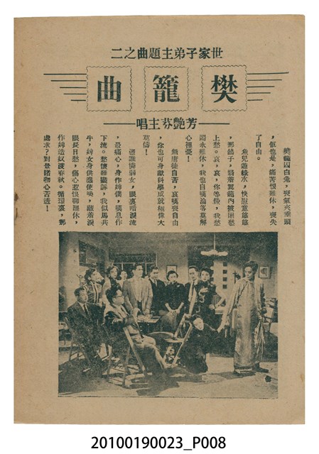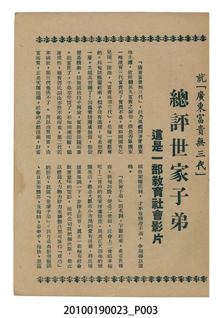 1. 香港電影《世家子弟》於越南的戲院上映時的電影本事小冊。本事封面印有「皇宮首輪新片」、「諷刺家庭倫理 歌唱奇情悲劇」廣告文字,以及主演演員名單。封底為下期上映影片廣告,介紹粵語片《小白菜情困楊乃武》,標明「清初四大奇案之一改編悽豔愛情大悲劇」、「小白菜悄佈胭脂陣」、「葛小大誤中奸徒計」與「楊乃武情困美人關」,並列出主演演員「芳艷芬」、「任劍輝」字樣。本事內頁則有《世家子弟》的電影介紹、電影故事、劇照、多首主題曲的曲詞、演員表,以及即將上映的電影《梁紅玉擊鼓退金兵》、《小白菜情困楊乃武》、《大明忠烈傳》的電影廣告。2. 香港電影《世家子弟》由義成電影企業於1956年出品,該片由左几執導,芳豔芬、張瑛等主演。左几原名黃左基,香港導演及編劇,以拍攝粵語片為主,共執導80多部電影。