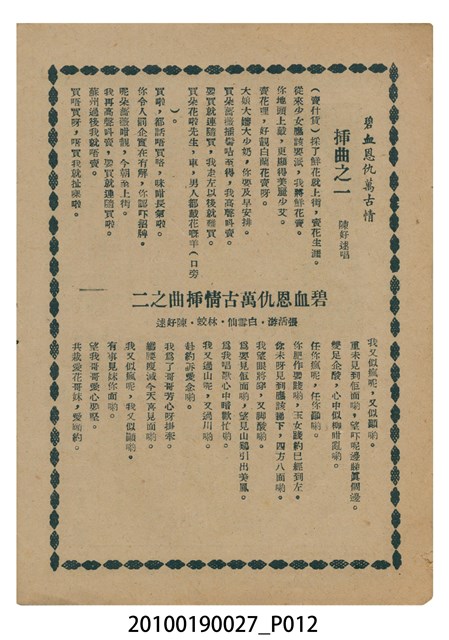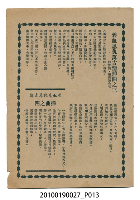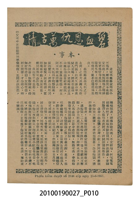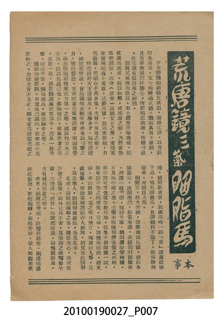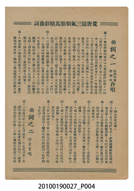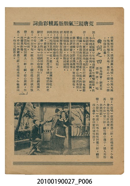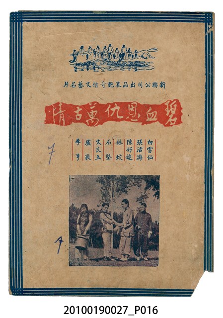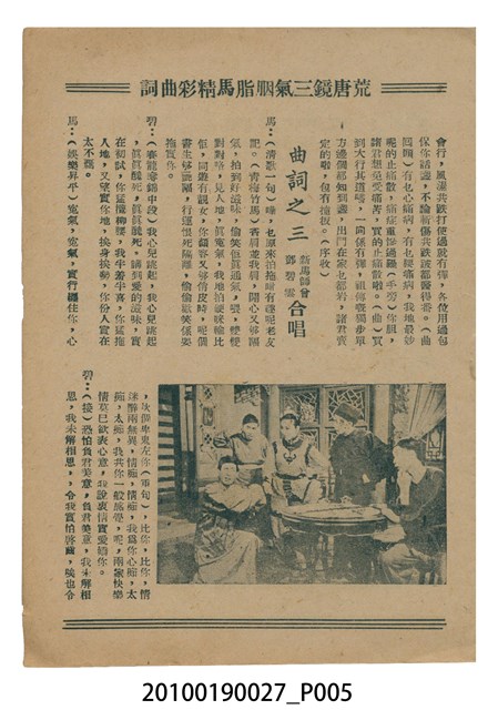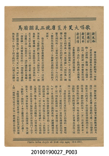1. 香港粵語片《荒唐鏡三氣胭脂馬》等片宣傳小冊,封面是新馬師曾、鄧碧雲的人形劇照,並標明片名,以及「新馬師曾 鄧碧雲」、「歌唱大笑片」字樣,封底則是粵語電影《碧血恩仇萬古情》(1956)的全版電影廣告。內頁包括香梘(香皂)廣告,《荒唐鏡三氣胭脂馬》的電影介紹、曲詞、電影本事,《碧血恩仇萬古情》的電影本事、歌詞與電影介紹,以及ovaltine阿華田的廣告。2.《荒唐鏡三氣胭脂馬》為1956年由香港重光影業公司出品,蔣偉光編導,新馬師曾、鄧碧雲等聯合演出的黑白粵語古裝喜劇電影,描述荒唐鏡巧遇賣武姑娘胡艷娟,為一較高下而交惡,荒唐鏡作弄娟父女,施計令二人冒險替他救出愛人的故事。