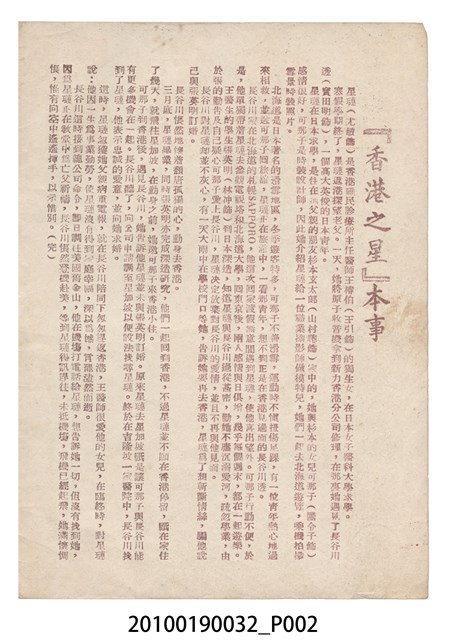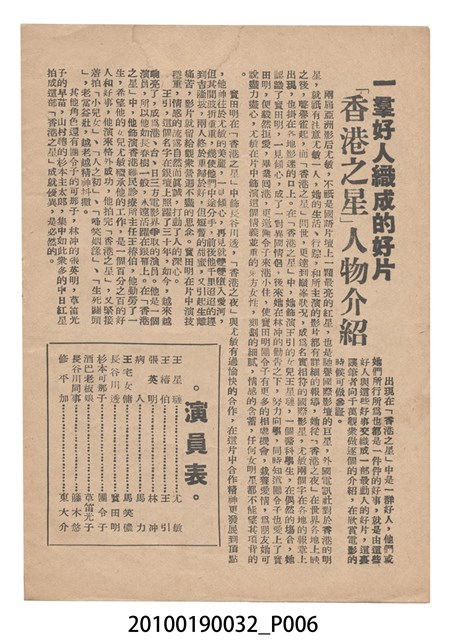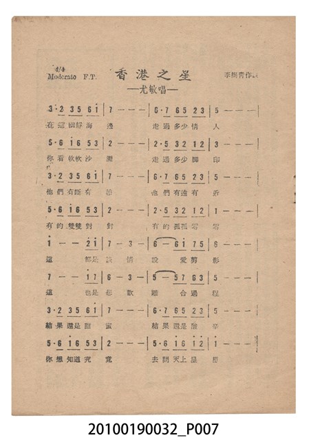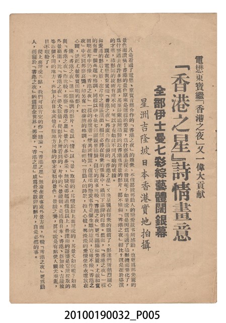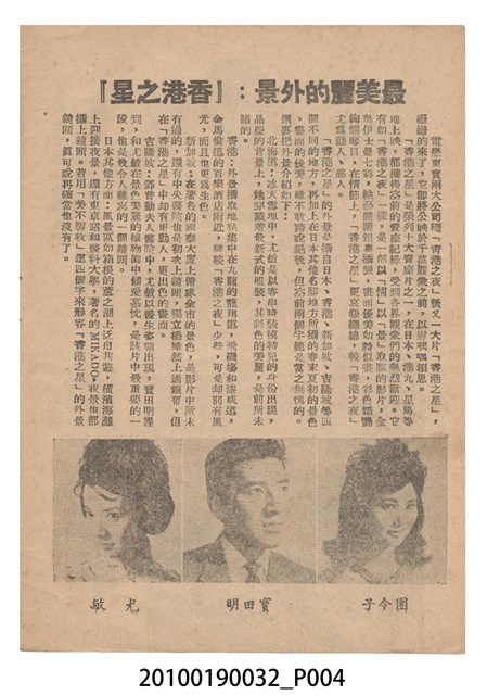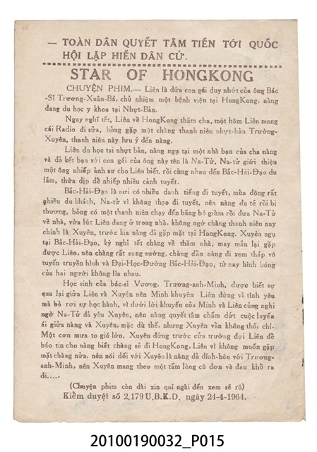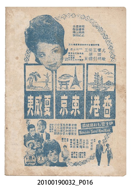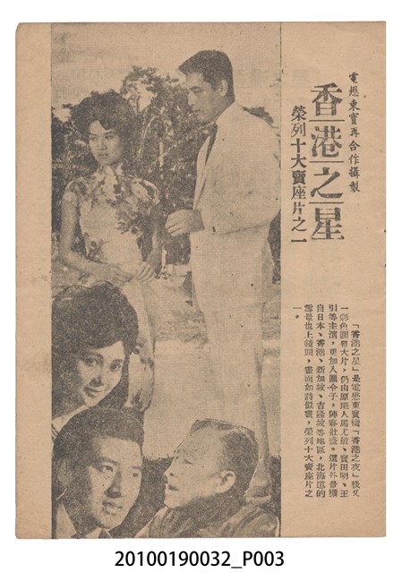 1. 港日合作攝製《香港之星》等片宣傳小冊,封面是女主角尤敏的劇照,並標明中英文片名及國際電影懋業有限公司的商標,封底則是國語電影《香港、東京、夏威夷》(1963)的全版電影廣告。內頁包括《香港之星》的電影本事、演員介紹、歌譜、電影小說及越語介紹。2.《香港之星》為1963年由香港國際電影懋業有限公司和日本東寶株式會社共同出品,千葉泰樹執導,笠原良三編劇,尤敏、寶田明、王引、團令子、林沖等聯合演出的黑白國日語劇情電影,描述王星璉(尤敏飾演)留學日本,某日她回香港探望父親時,邂逅日本青年長谷川透,兩人漸生情素,後星璉因好友勸阻以及誤會好友傾心透,兩人逐漸疏遠,是一對有情人陰錯陽差錯過彼此的愛情故事。