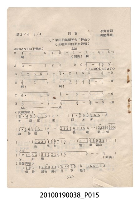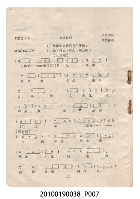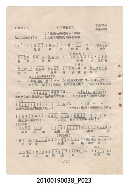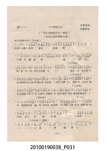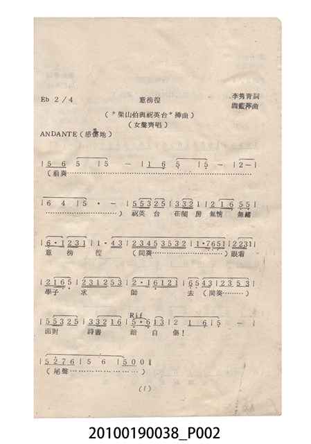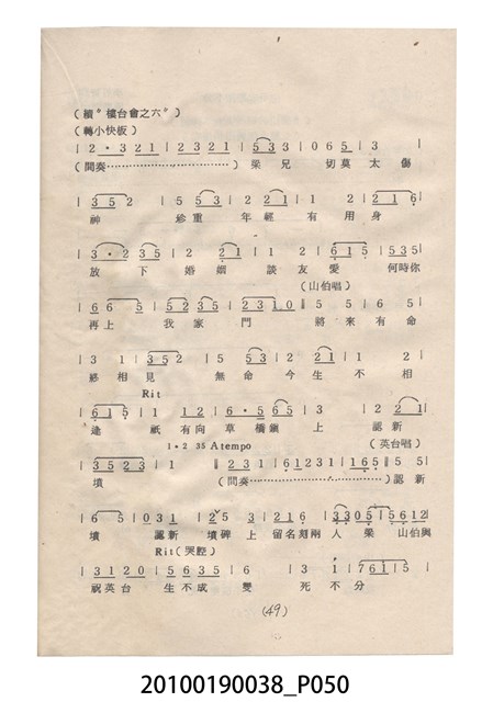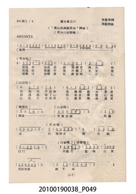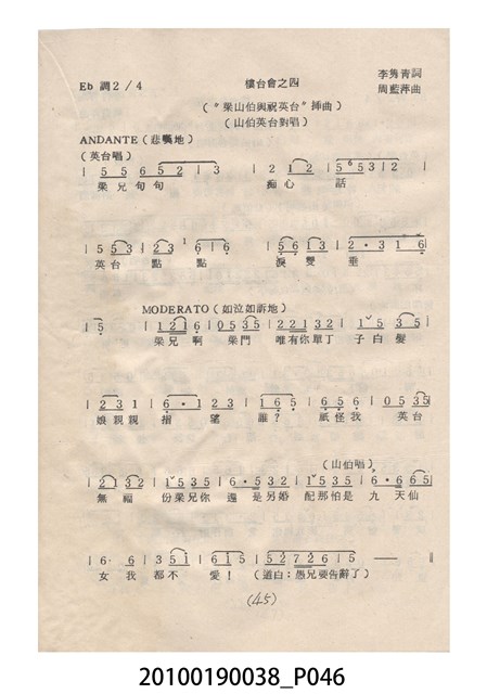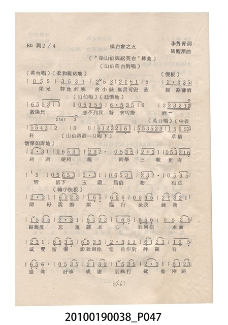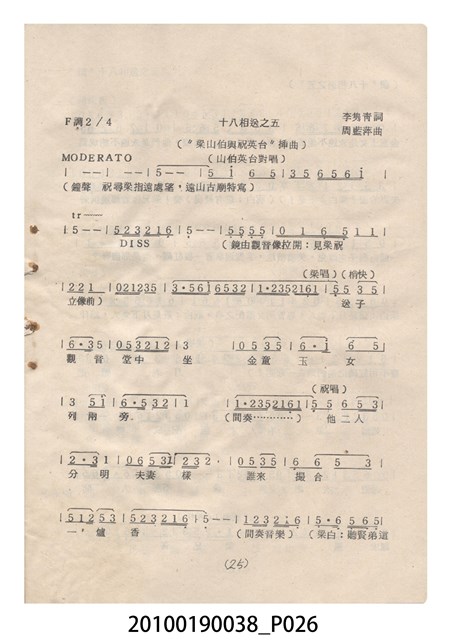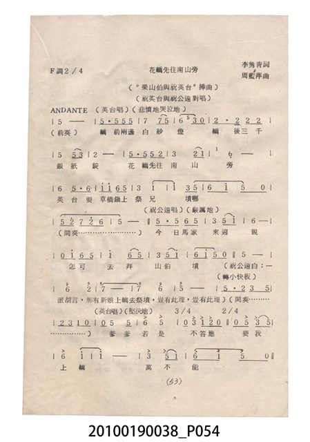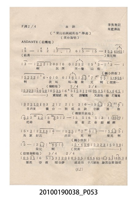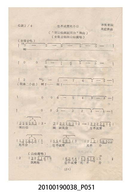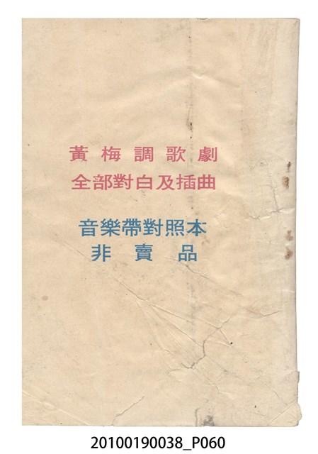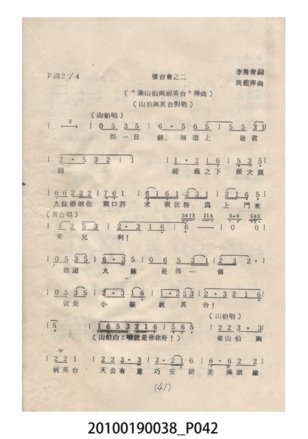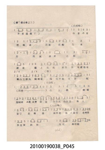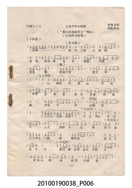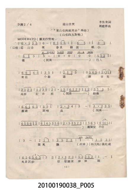 1. 香港國語片《梁山伯與祝英台》電影歌曲集,封面是以樂蒂與凌波為主角的手繪圖,並標明中英片名、「樂蒂 凌波 主演」、「導演 李翰祥」等字樣,封底則是素色,標明「黃梅調歌劇全部對白及插曲」、「音樂帶對照本」、「非賣品」字樣。內頁皆為歌譜。2.《梁山伯與祝英台》為1963年由香港邵氏兄弟(香港)有限公司出品,李翰祥編導,樂蒂、凌波等聯合演出的彩色國語黃梅調電影,描述祝英台女扮男裝求學,結識同窗梁山伯,兩人無法締結音緣的愛情悲劇故事。