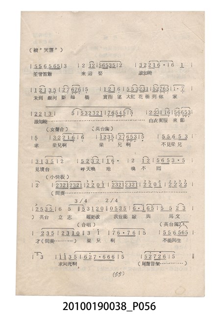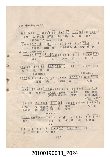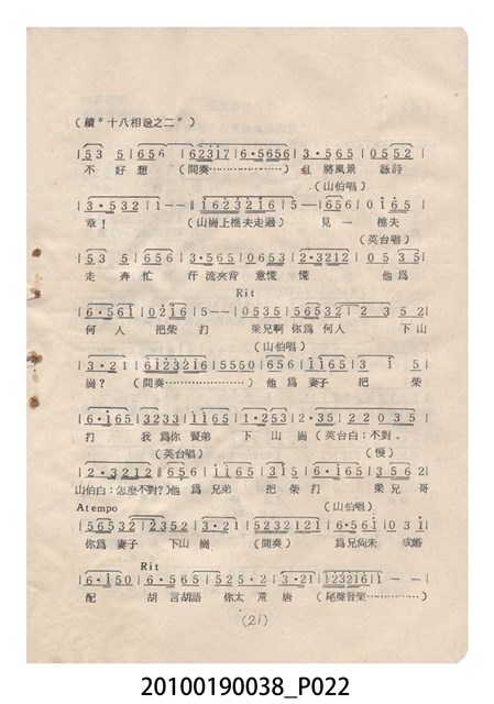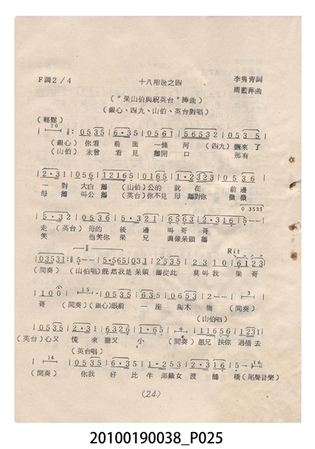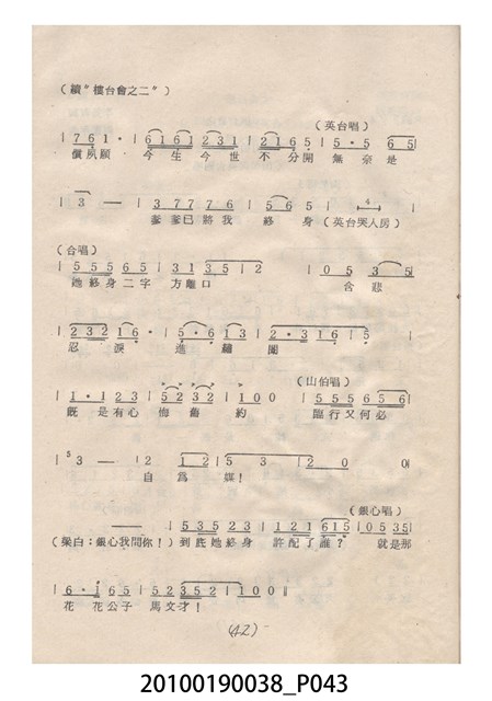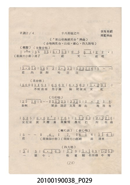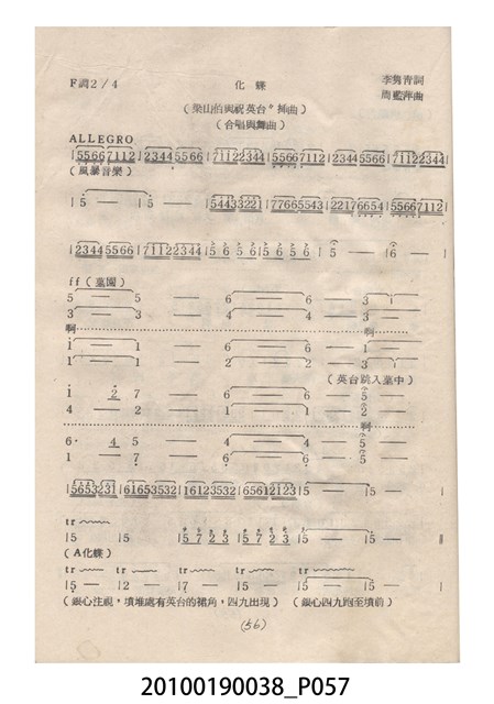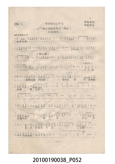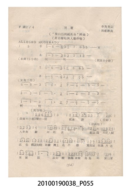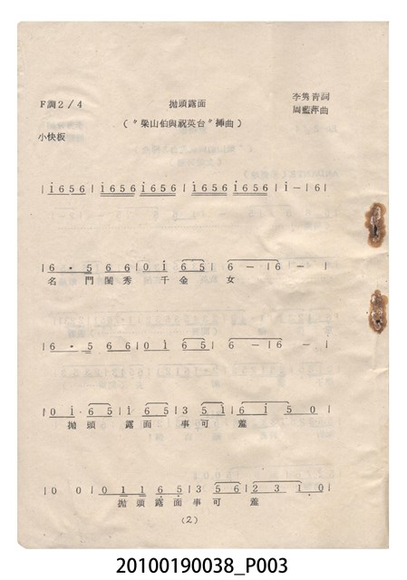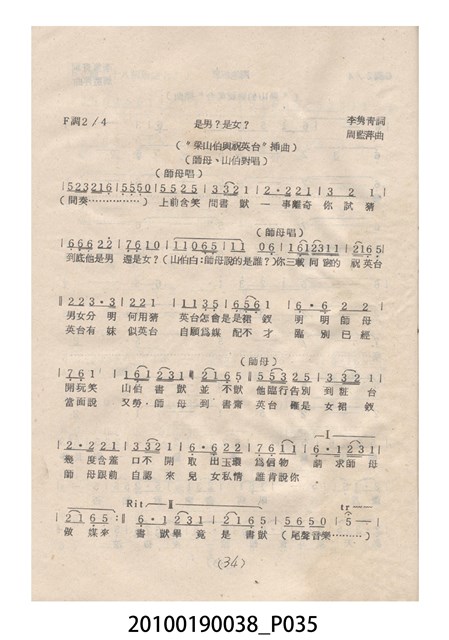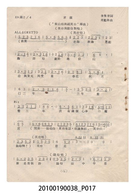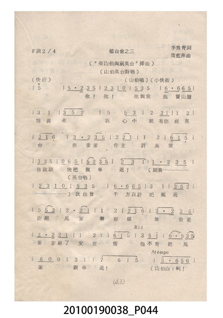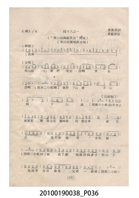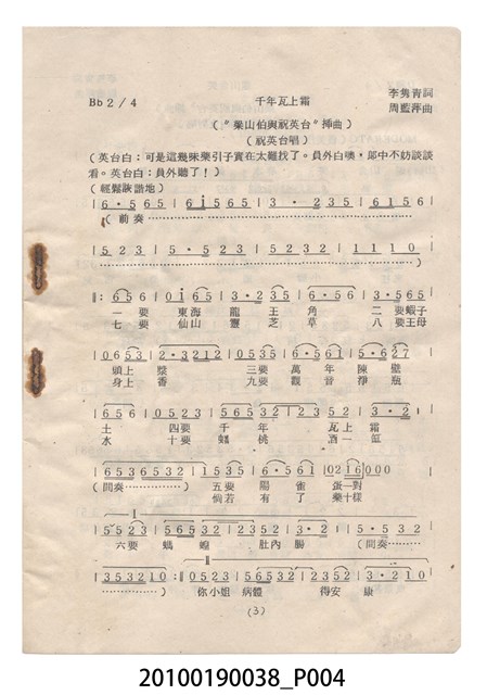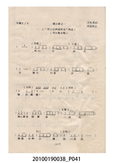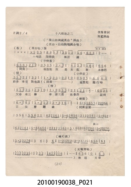 1. 香港國語片《梁山伯與祝英台》電影歌曲集,封面是以樂蒂與凌波為主角的手繪圖,並標明中英片名、「樂蒂 凌波 主演」、「導演 李翰祥」等字樣,封底則是素色,標明「黃梅調歌劇全部對白及插曲」、「音樂帶對照本」、「非賣品」字樣。內頁皆為歌譜。2.《梁山伯與祝英台》為1963年由香港邵氏兄弟(香港)有限公司出品,李翰祥編導,樂蒂、凌波等聯合演出的彩色國語黃梅調電影,描述祝英台女扮男裝求學,結識同窗梁山伯,兩人無法締結音緣的愛情悲劇故事。