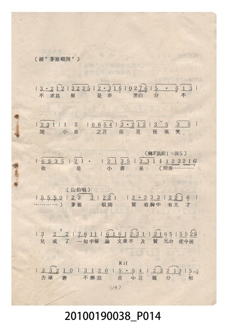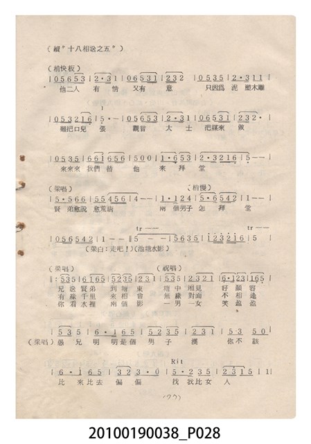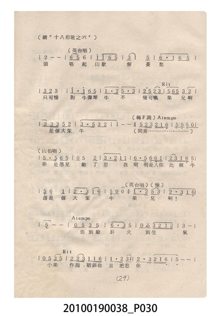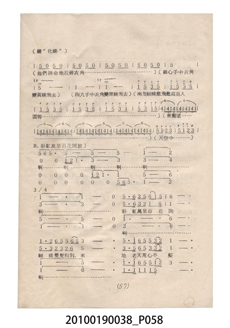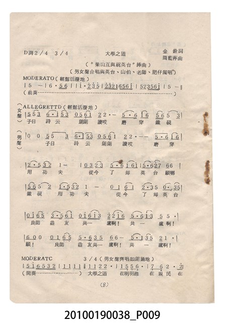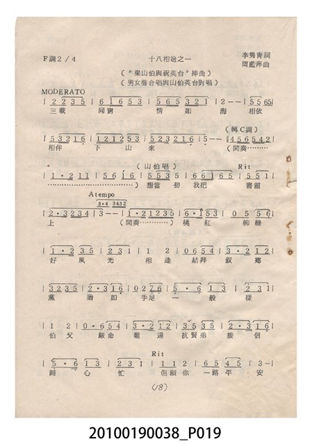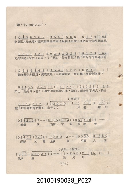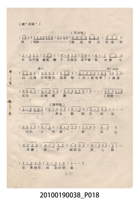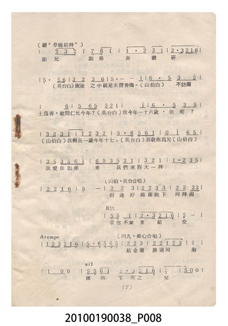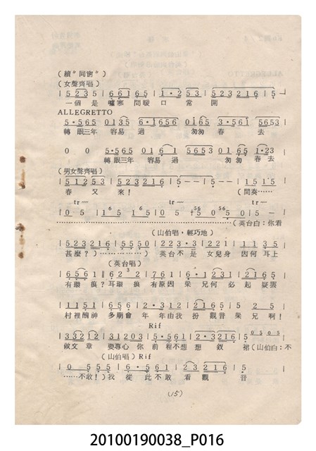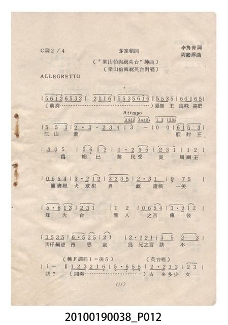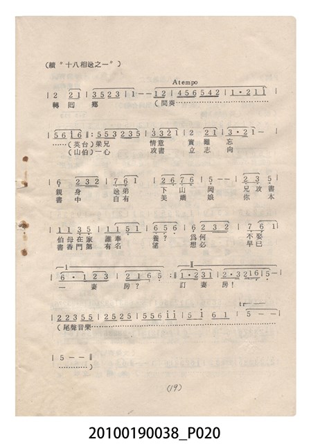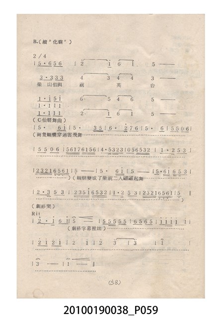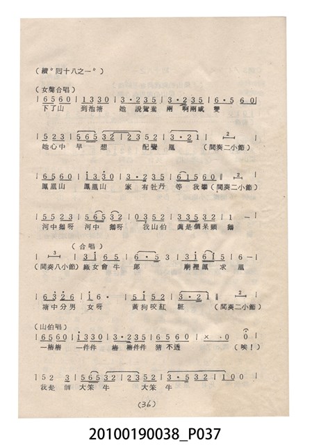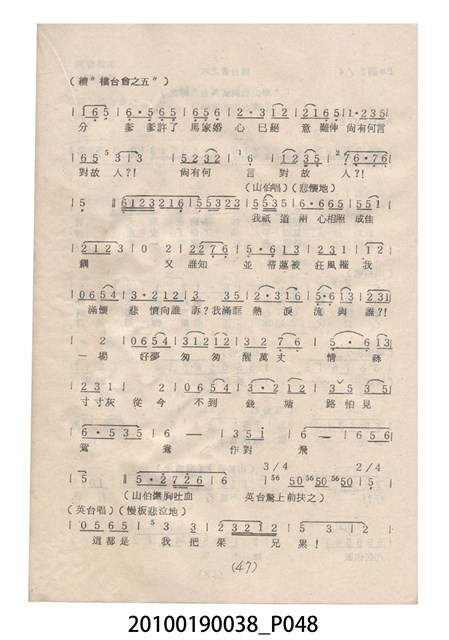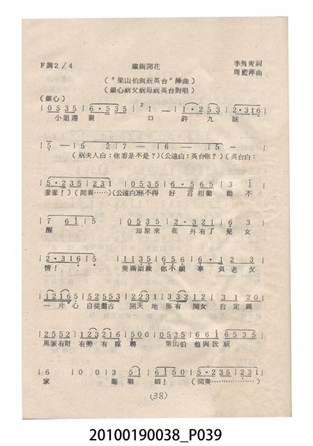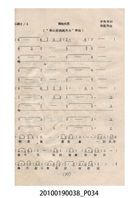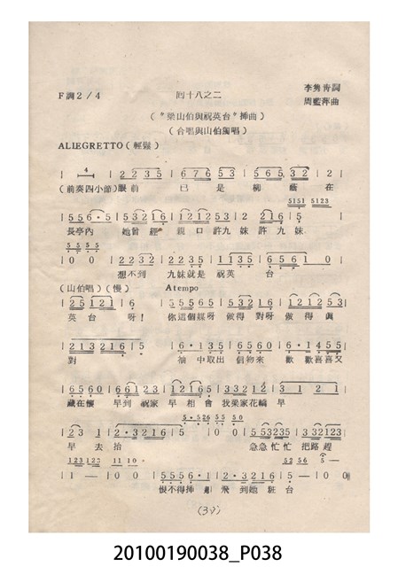 1. 香港國語片《梁山伯與祝英台》電影歌曲集,封面是以樂蒂與凌波為主角的手繪圖,並標明中英片名、「樂蒂 凌波 主演」、「導演 李翰祥」等字樣,封底則是素色,標明「黃梅調歌劇全部對白及插曲」、「音樂帶對照本」、「非賣品」字樣。內頁皆為歌譜。2.《梁山伯與祝英台》為1963年由香港邵氏兄弟(香港)有限公司出品,李翰祥編導,樂蒂、凌波等聯合演出的彩色國語黃梅調電影,描述祝英台女扮男裝求學,結識同窗梁山伯,兩人無法締結音緣的愛情悲劇故事。