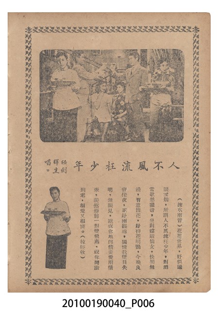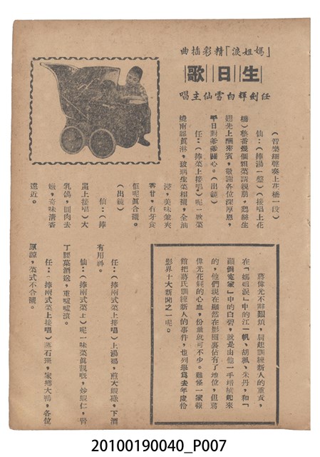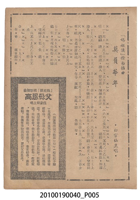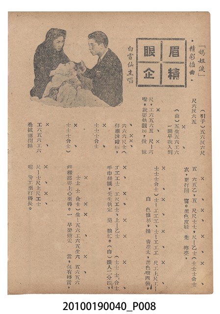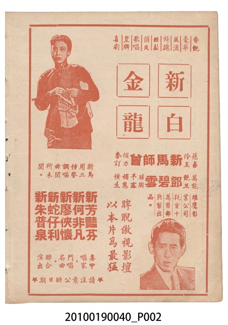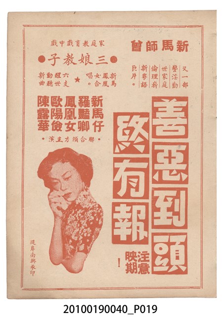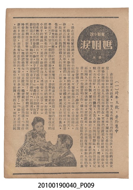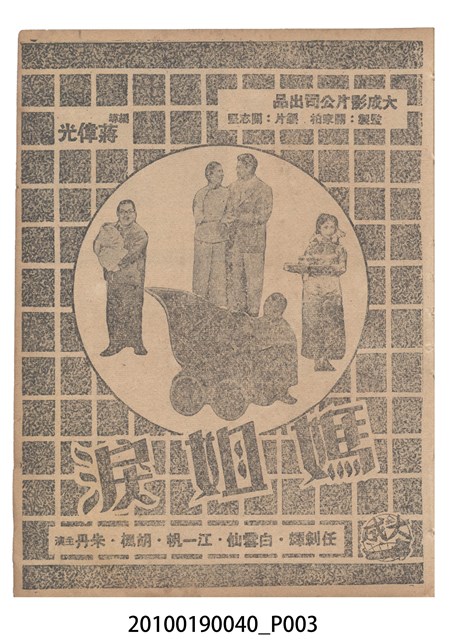1. 香港粵語片《媽姐淚》等片宣傳小冊,封面是女主角白雪仙的劇照,並標明片名及大成影片公司的商標,封底則是胡楓的劇照。內頁包括香港粵語片《新白金龍》(1954)的電影廣告,《媽姐淚》的電影廣告、曲詞、電影小說,以及《善惡到頭終有報》(1954)的全版廣告。2.《媽姐淚》為1954年由香港 大成影片公司出品,蔣偉光編導,任劍輝、白雪仙、江一帆、胡楓等聯合演出的黑白粵語電影,描述任珍(任劍輝飾演)、任珠(白雪仙飾演)分別於江、胡兩家當傭人,分別與兩家的少爺相好,但因身份差異,兩對戀人皆被父母反對,直至任珠為胡家生下一子,才改變兩對戀人的命運。