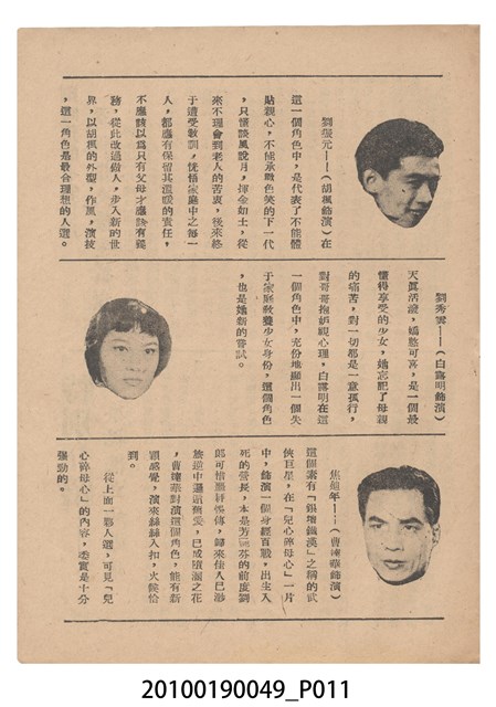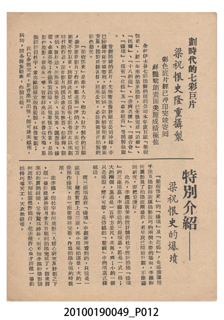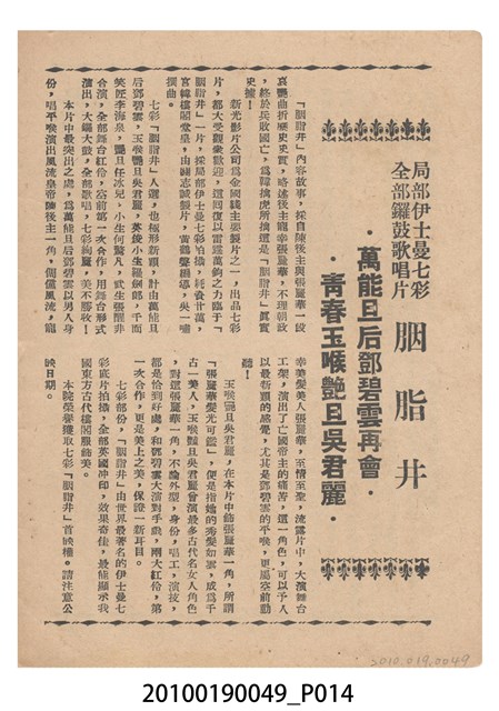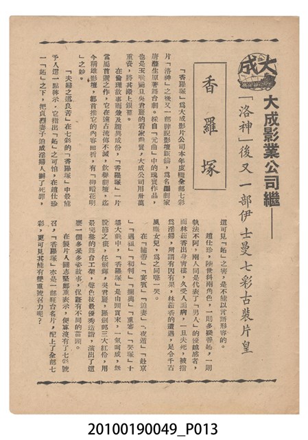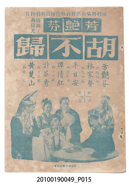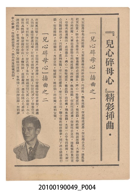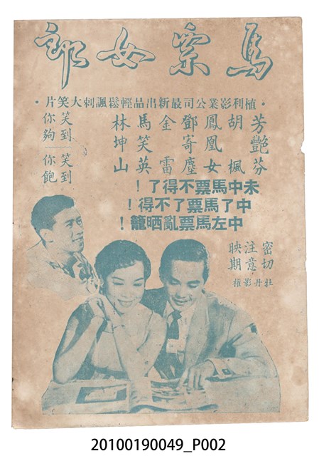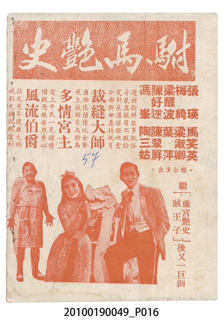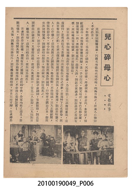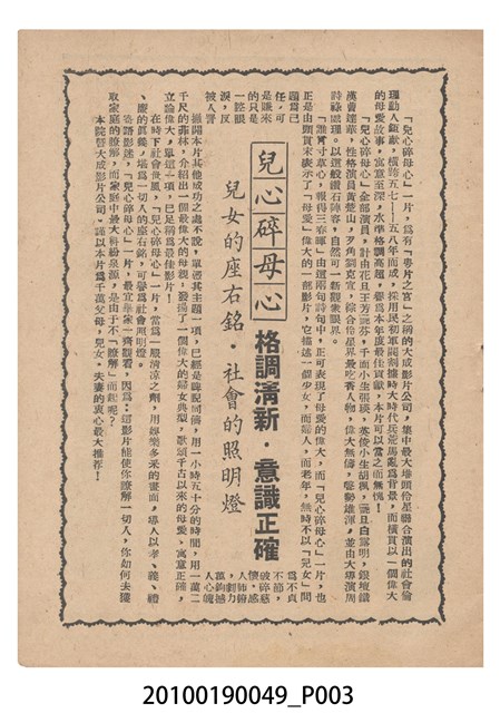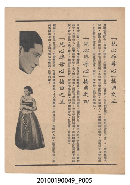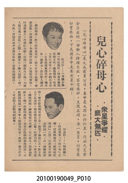 1. 香港電影《兒女碎母心》於越南的戲院上映時的電影本事小冊。本事封面以紅藍雙色印刷,在愛心圖樣上印有片名「兒女碎母心」。本事封底為下期上映影片廣告,介紹由金門影業出品的香港電影《駙馬艷史》(1931),並有「裁縫大師」、「多情宮主」與「風流伯爵」等廣告文案並列出主演演員名單。本事內頁則為《兒女碎母心》的電影教化意義介紹、插曲曲詞、電影故事與演員表及演員介紹等,以及即將上映電影《馬票女郎》、《胡不歸》的電影廣告。2. 香港電影《兒女碎母心》由百榮影業公司於1950年出品。該片由吳回執導,白燕、白雲、張瑛等領銜主演。百榮影業公司為活躍於1950年代的香港電影公司,曾出品《兒女碎母心》、《白眉毛三戰白菊花》(1950)、《烏龍姻緣》(1951)等粵語電影。