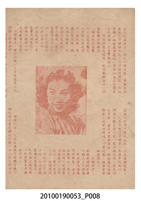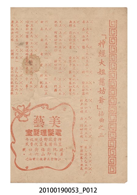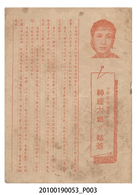 1. 香港粵語片《神經大姐戇姑爺》等片宣傳小冊,封面是鄧碧雲與羅劍郎的劇照,搭配一小張任劍輝的圓形劇照,並標明片名,封底則是豪華溜冰場的全版電影廣告。內頁包括豪華大戲院的的電影廣告,《神經大姐戇姑爺》的電影介紹、電影小說、曲詞等,以及香港粵語片《雄寡婦》(1955)的全版廣告。2.《神經大姐戇姑爺》為1956年由香港平安影業公司出品,馮志剛導演,馮一葦編劇,任劍輝、鄧碧雲、羅劍郎等聯合演出的黑白粵語電影,描述鄧秀全想找個富家子當女婿,便施計令女兒鄧筱雲與素未謀面的未婚夫盧瑞輝見面,但兩人因誤會而退婚,不歡而散後,鄧筱雲便假扮成跛腳富婆,盧瑞輝也偽裝成富家子何劍陵,兩人互相戲弄的故事。