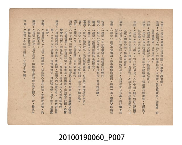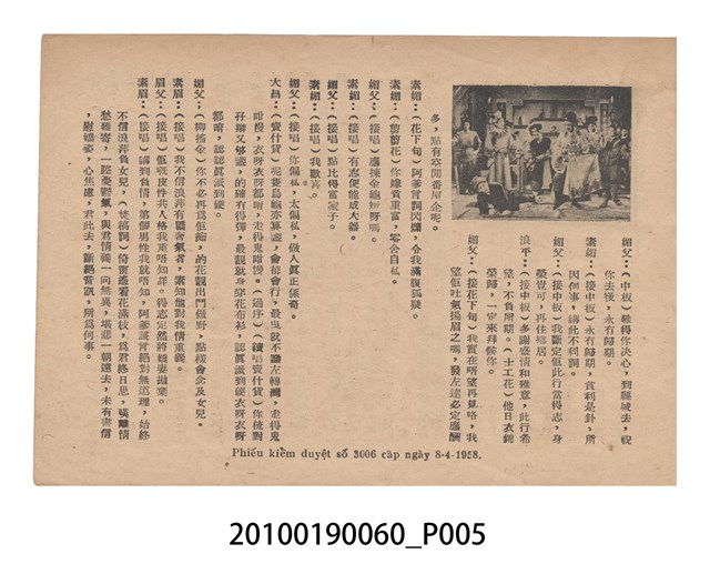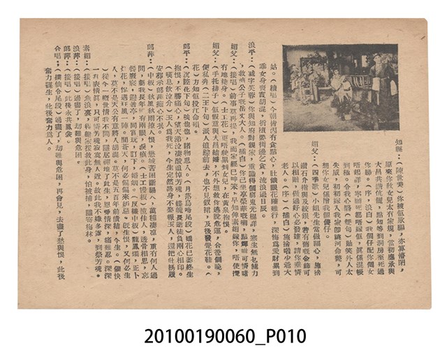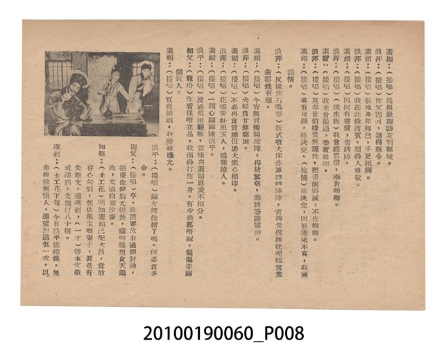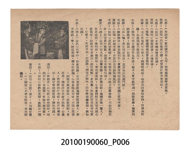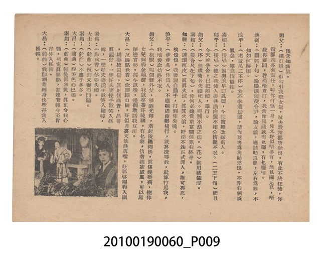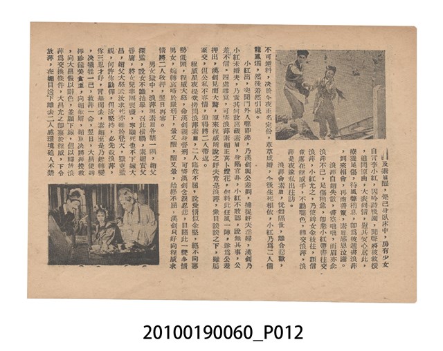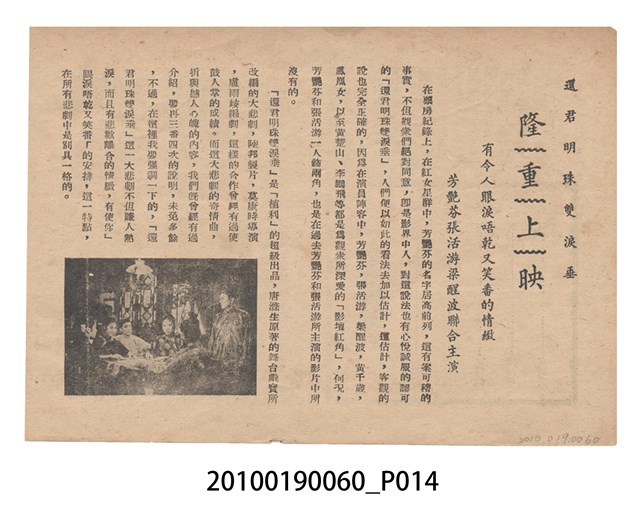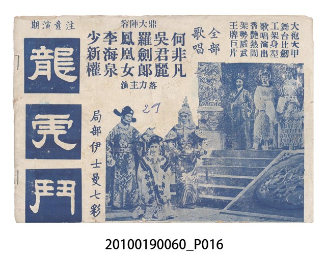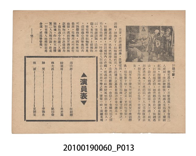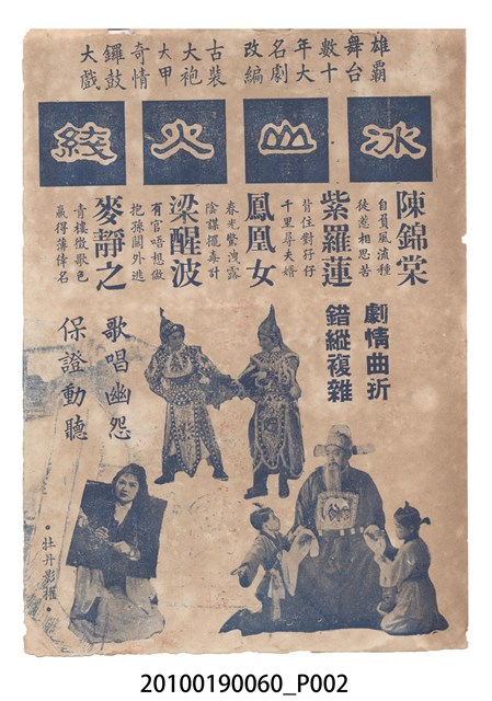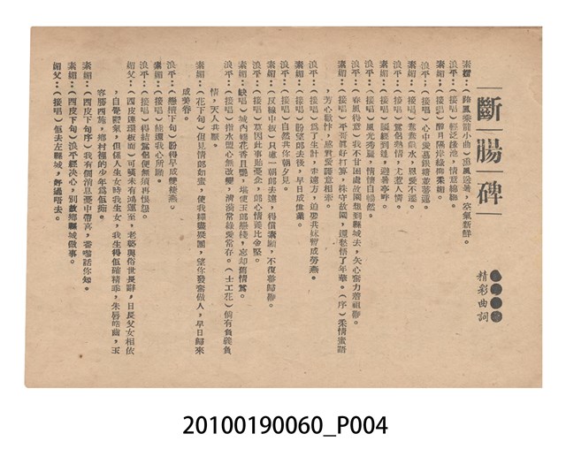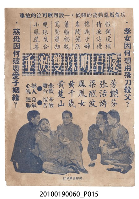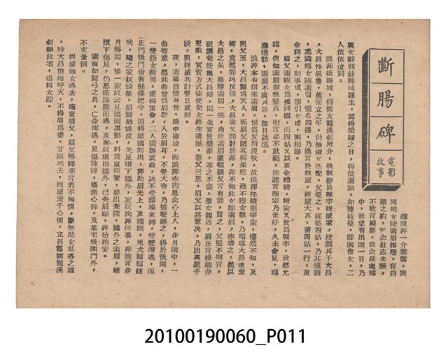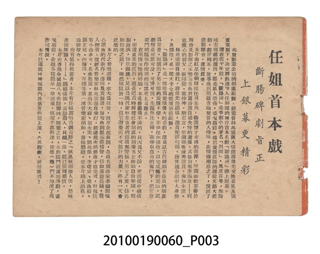 1. 香港粵語片《斷腸碑》等片宣傳小冊,封面是任劍輝、吳君麗為主的劇照,搭配手繪的墓碑,並標明片名、「任劍輝 吳君麗 李海泉 歐陽儉 劉克宣 蕭仲坤」字樣,封底則是粵語電影《龍虎鬥》(1957)的全版電影廣告。內頁包括香港粵語片《冰山火線》(1958)的電影廣告,香港粵語片《斷腸碑》的演員介紹、曲詞、電影故事,以及香港粵語片《還君明珠雙淚垂》(1957)的電影介紹、電影廣告。2.《斷腸碑書》為1958年由香港兆豐公司出品,蔣偉光編導,任劍輝、吳君麗、歐陽儉等聯合演出的黑白粵語古裝電影,描述杜素眉與窮書生陳浪萍相戀,但素眉之父一心欲將素眉嫁給程知縣的傻兒子,這對戀人經歷重重波折,終得成眷屬的故事。