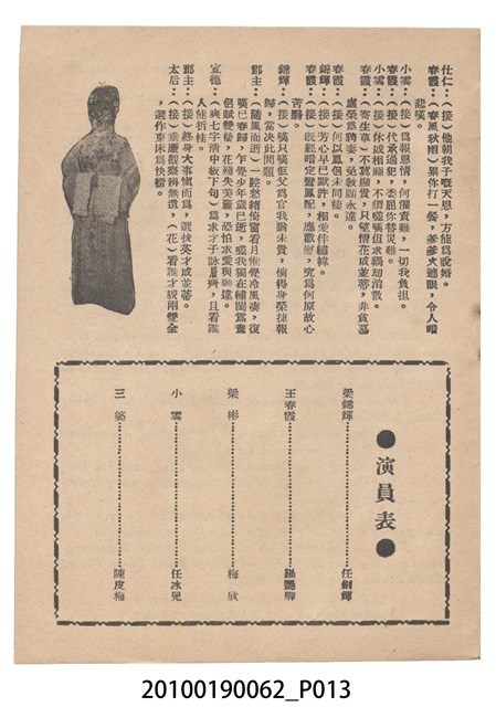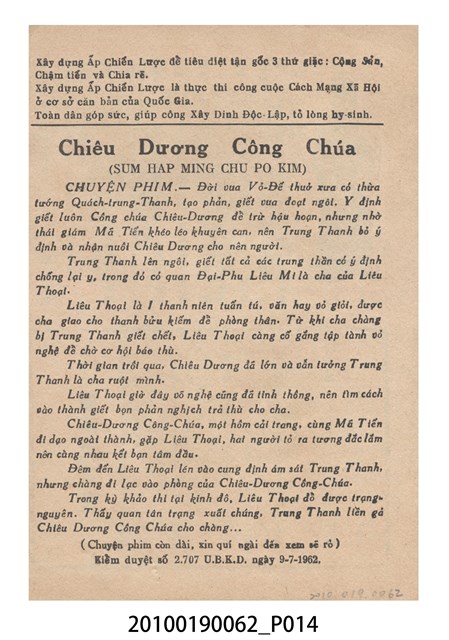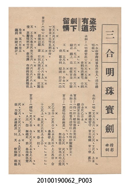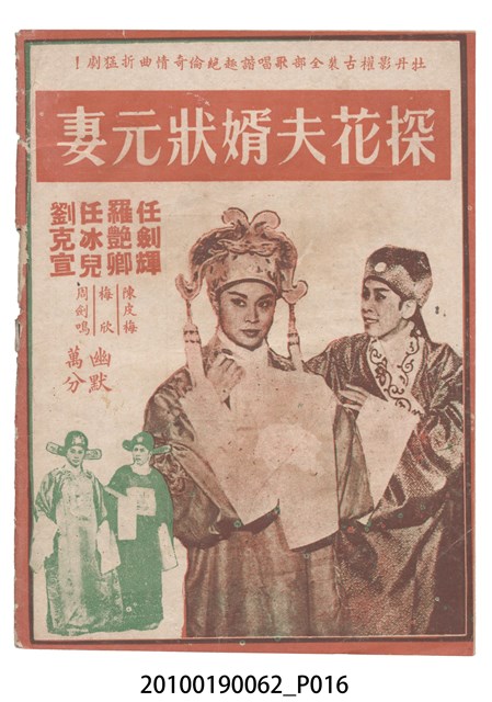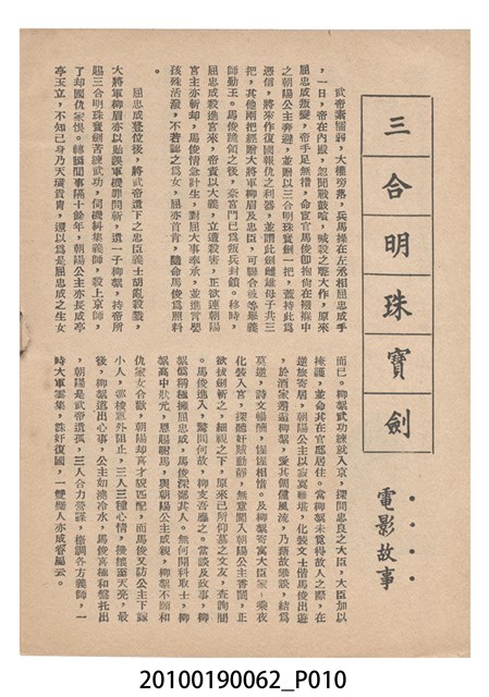 1. 香港電影《三合明珠寶劍》於越南上映時的雙色印刷電影本事小冊。正面上方有片名「三合明珠寶劍」及一張四名演員身穿戲曲服裝的劇照。封底為影片介紹,介紹《探花夫婿狀元妻》,標明「幽默萬分」,並列出「任劍輝 羅艷卿 任冰兒 劉客宣」等主演演員名單,版面主要以任劍輝與羅艷卿的人形圖像佔比最大。本事內頁則為《三合明珠寶劍》的曲詞和工尺譜與演員表,以及即將牡丹公司大片陣容《金刀會五龍》、《孝女雪奇冤》、《白猿女三盜寶蓮燈》、《寶兒孝祖救雙親》、《猿女復仇記》、《倩女情俠》、《慾海女人心》的電影廣告。2. 《三合明珠寶劍》為冠生影業公司1961年出品的粵語戲曲片。影片由楊工良導演、胡文森撰曲,新馬仔、鄧碧雲、梁醒波主演。本片改編自舞台劇,為冠生影業公司的創業作,該公司僅出品過《三合明珠寶劍》與《新夜弔秋喜》(1963)兩部影片。楊工良導演早年從事默片字幕翻譯,精通英文,擅長開發中西文化兼容的粵語片,執導類型包括懸疑片、名伶喜劇、歌唱片和神怪武俠片等,活躍於1940-1950年代。
