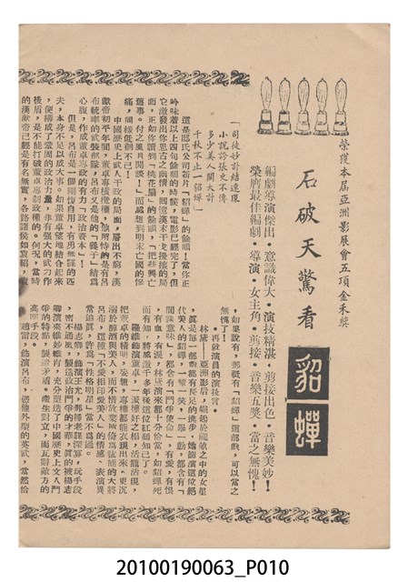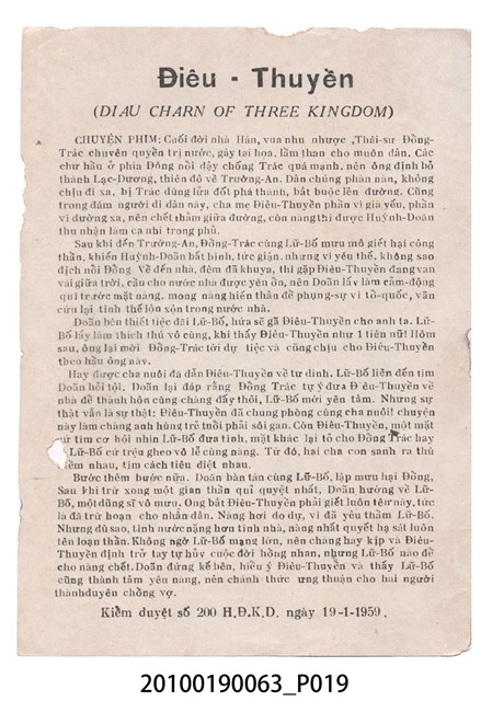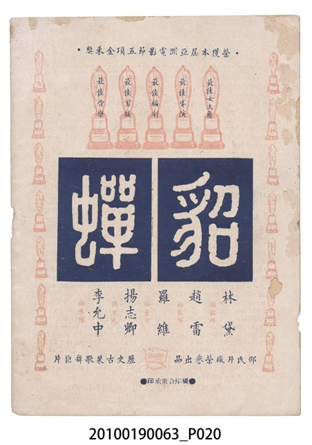 1. 香港國語片《貂蟬》等片宣傳小冊,封面是女主角林黛的劇照,並標明片名、邵氏商標、「本屆亞展五項金禾獎」、「邵氏製片廠榮譽鉅製」字樣,封底同樣是《貂蟬》的全版電影廣告。內頁包括《貂蟬》的歌譜、電影介紹等。2.《貂蟬》為1958年由香港邵氏製片廠 (即邵氏父子有限公司)出品,李翰祥導演,高立編劇,林黛、趙雷、羅維等聯合演出的彩色國語古裝電影,描述漢朝末年,奸臣董卓專權禍國,忠臣王允利用貂蟬的美色,離間董卓和其義子呂布,最終呂布殺了董卓,並和貂蟬成為眷屬的故事。