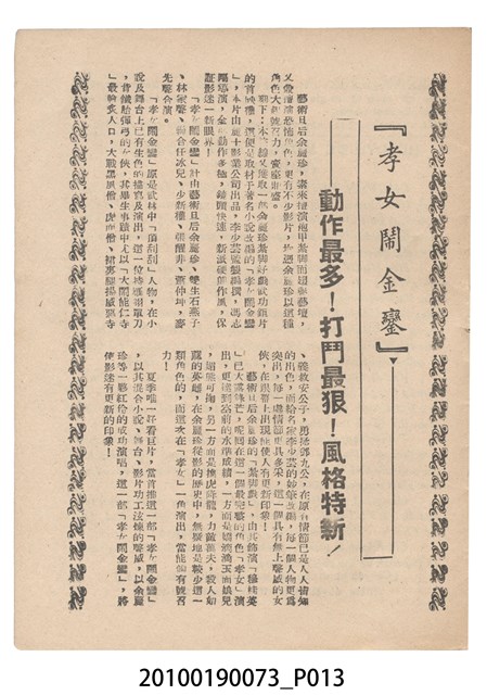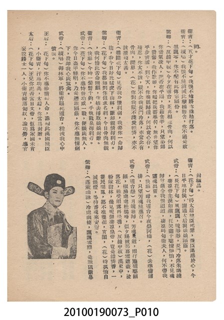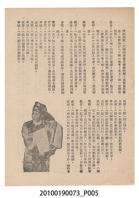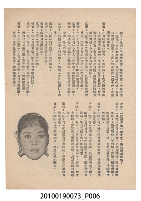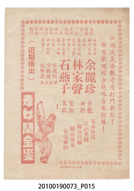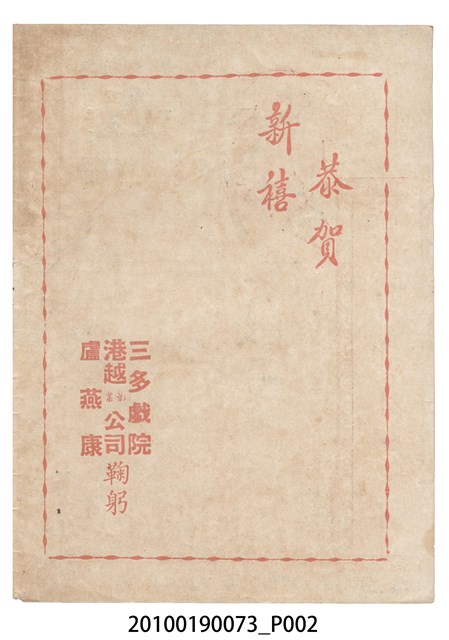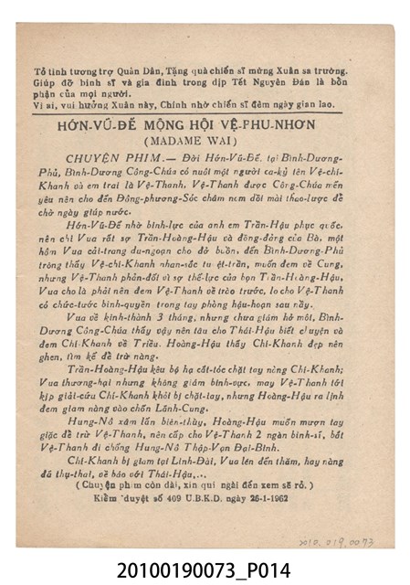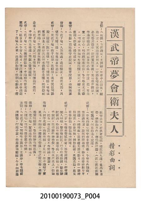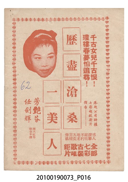 1. 香港粵語片《漢武帝夢會衛夫人》等片宣傳小冊,封面是芳艷芬與任劍輝的人形劇照,並標明片名、「全部伊士曼七彩」、「三多影業公司映權」字樣,封底則是粵語電影《歷盡滄桑一美人》(香銷十二美人樓,1958)的全版電影廣告。內頁包括恭賀新禧的廣告,《漢武帝夢會衛夫人》的電影介紹、曲詞、電影故事,以及香港粵語片《孝女鬧金鑾》(無頭正宮教子鬧金鑾,1961)的電影預告介紹。2.《漢武帝夢會衛夫人》為1960年由香港大成影片公司出品,珠璣導演,唐滌生編劇,芳艷芬、任劍輝、林家聲等聯合演出的彩色粵語戲曲電影,描述漢武帝邂逅歌姬衛紫卿,封其為衛夫人,引發陳皇后妒意,陳皇后幽禁衛紫卿,幸得衛紫卿之弟相救,漢武帝與歌姬才再度重逢的故事。