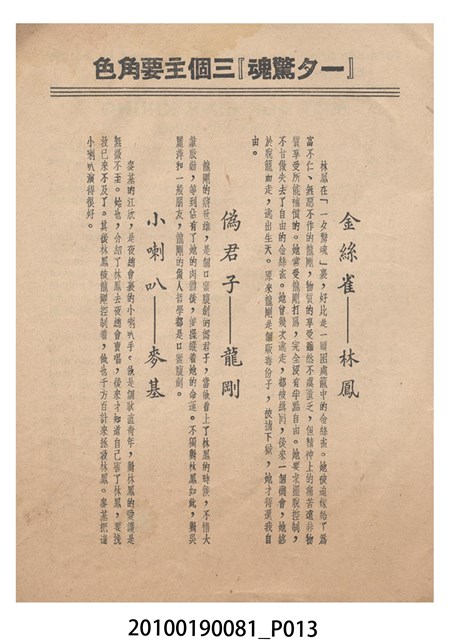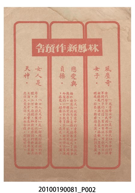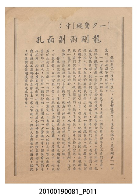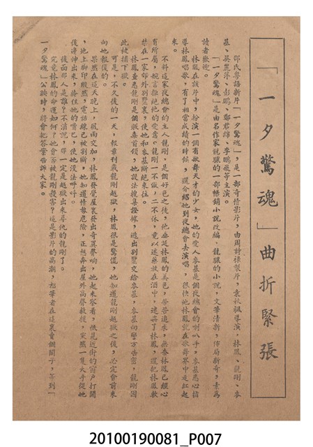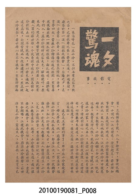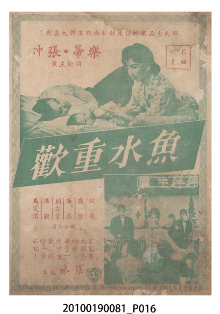 1. 香港電影《一夕驚魂》於越南上映時的雙色印刷電影本事小冊。正面上有片名「一夕驚魂」,片名旁有「袁秋楓導演・邵氏製片」、「林鳳、龍剛、麥基」字樣,並左印有男女主角的半身像。右下角有邵氏兄弟的商標。本事封底為影片廣告,介紹《魚水重歡》,標有「邵氏出品風趣俏皮輕鬆幽默王牌大喜劇!」、「名曲六隻支」、「家家有本難念的經,看了『魚水重歡』糾紛一掃而空!」、「羅臻 編導」廣告文字,並列出主演演員名單,以及邵氏兄弟商標。本事內頁則收錄《風塵奇女子》、《戀愛與貞操》、《女人是天神》和《倩女幽魂》的電影宣傳。2. 《一夕驚魂》為邵氏兄弟(香港)有限公司1958年出品的粵語時裝片。影片由袁秋楓編導,林鳳、龍剛、麥基主演。邵氏兄弟前身是1925年於新加坡成立的邵氏公司。1958年,邵逸夫與邵仁枚成立邵氏兄弟(香港)有限公司,在香港製作電影,邵逸夫任總裁。2011年名為邵氏製作有限公司及邵氏影城有限公司,2015年名為邵氏兄弟電影有限公司,2016年名為邵氏兄弟國際影業有限公司。
