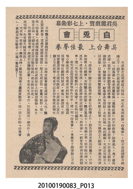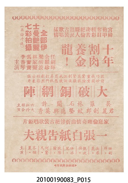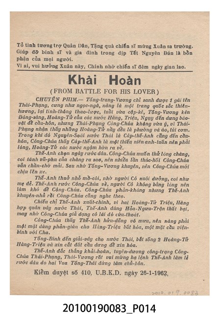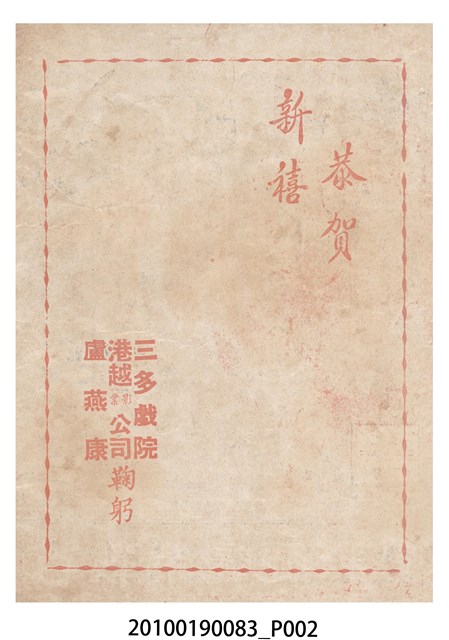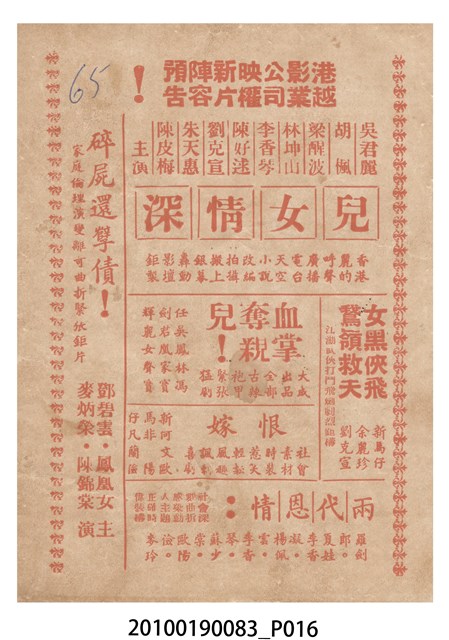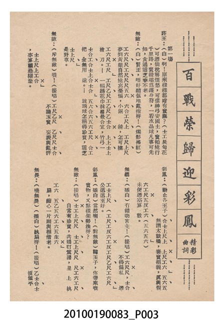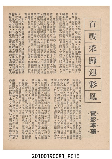 1. 香港電影《百戰榮歸迎彩鳳》於越南的三多戲院上映時的彩色印刷電影本事小冊。正面上有片名「百戰榮歸迎彩鳳」,封面為滿版的劇照。左右下角分別有「三多影業公司」與「美的電版」的商標。本事封底為「港越影業公司映權新片陣容預告」的影片,介紹「香港麗的呼聲廣播電台天空小說改編拍攝搬上銀幕轟動影壇鉅製」《兒女情深》,並列出主演演員名單。介紹「江湖武俠打鬥飛劍劇烈鉅構」《女黑俠飛鵞嶺救夫》,並列出主演演員名單。介紹「大成出品全部古裝袍甲緊張猛劇」《血掌奪親兒!》,並列出主演演員名單。介紹「社會素材時裝惹笑輕鬆風趣諷刺喜劇」《恨嫁》,並列出主演演員名單。介紹「社會深刻曲折感染動人主題正確時偉裝構」《兩代恩情》,並列出主演演員名單。介紹「家庭倫理演變離奇曲折緊張鉅片」《碎屍還孽債》,並列出主演演員名單。本事內頁則收錄《白兔會》、《十年割肉養金龍!》、《大破銅網陣》和《一張白紙告親夫》的電影宣傳。2. 《百戰榮歸迎彩鳳》為大龍鳳影業公司1961年出品的粵語古裝戲曲片。影片由黃鶴聲導演、潘焯撰曲,麥炳榮、鳳凰女、林家聲主演。大龍鳳影業公司由大龍鳳劇團班主何少保成立,專門將粵劇戲寶改拍成電影,活躍於1950-1960年代。