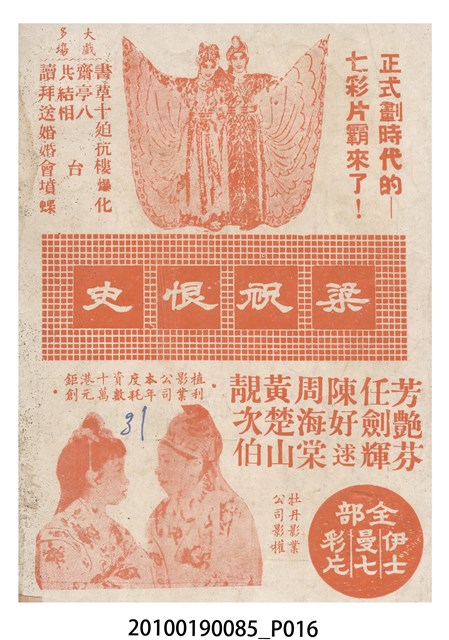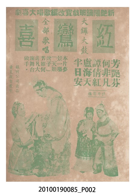1. 香港粵語片《還君明珠雙淚垂》等片宣傳小冊,封面是芳艷芬與張活游為主的人形劇照,並標明片名、主演名,封底則是粵語電影《梁祝恨史》(1958)的全版電影廣告。內頁包括1. 香港粵語片《紅鸞喜》(1957)的電影廣告,《還君明珠雙淚垂》的電影介紹、曲詞、電影本事等,以及香港粵語片《斷腸碑》(1958)的全版廣告。2.《還君明珠雙淚垂》為1957年由香港植利影業公司出品,莫康時導演,盧雨岐編劇,芳艷芬、張活游、梁醒波等聯合演出的黑白粵語古裝電影,唐滌生原著舞台戲改編的悲劇故事