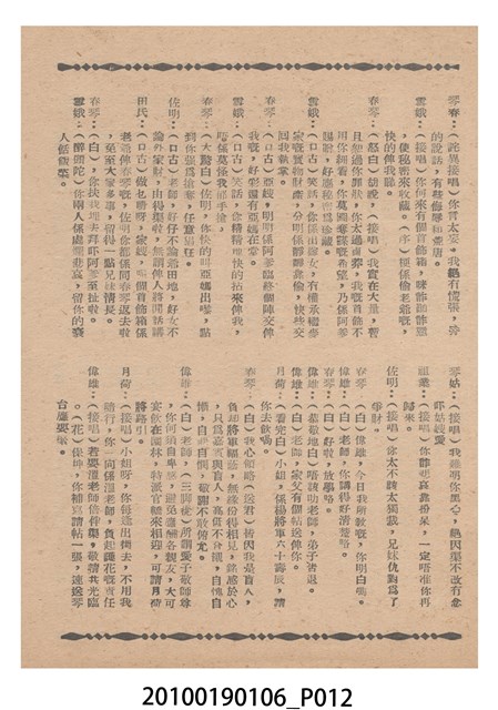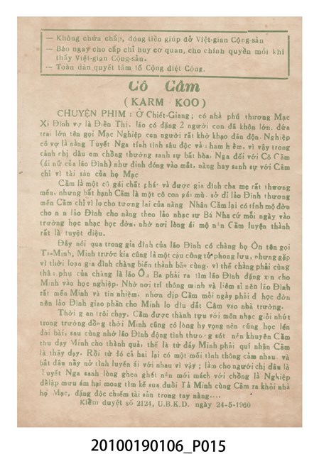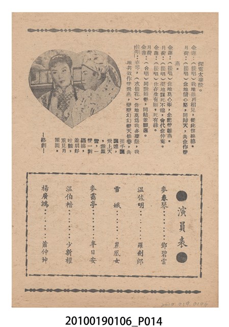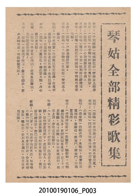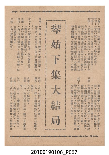 1. 香港粵語片《琴姑大結局上下兩集合編》等片宣傳小冊,封面是女主角鄧碧雲的人形劇照,並標明片名、主演名、「第壹部驚人歌唱特刊」等字樣,封底則是《琴姑大結局上下兩集合編》電影廣告搭配藥品廣告。內頁包括1. 香港粵語片《琴姑》(1959)的電影故事、歌詞等。2.《琴姑》與《琴姑大結局》為1959年由香港永茂電影企業公司出品,黃岱導演,萬世師編劇,鄧碧雲、羅劍郎、鳳凰女等聯合演出的黑白粵語古裝電影,改編自麗的呼聲天空小說,描述麥春琴與溫佐明的愛情悲劇。