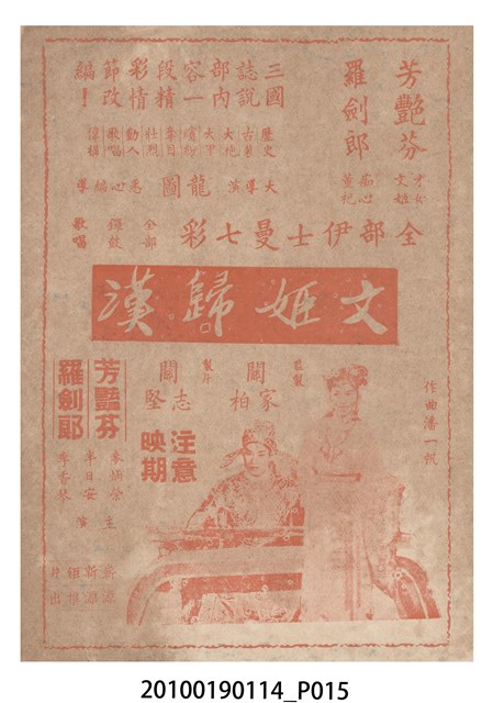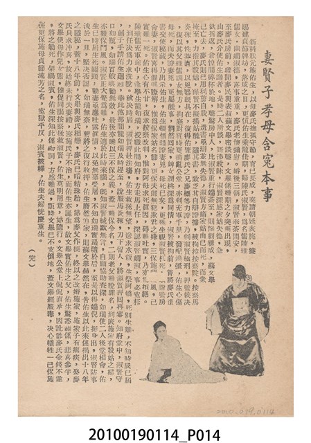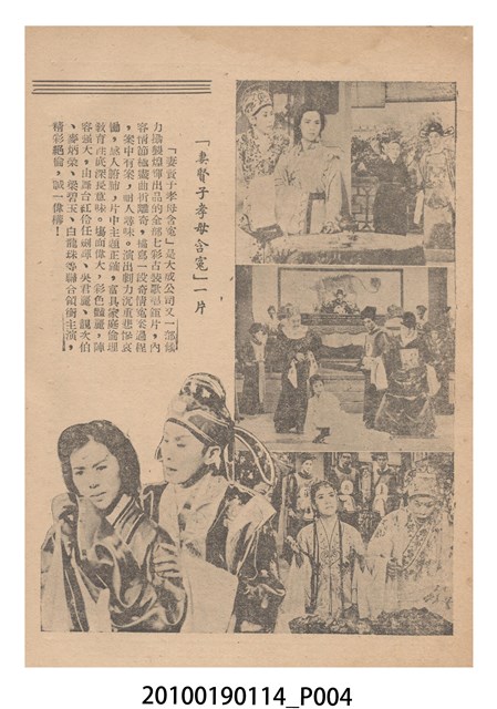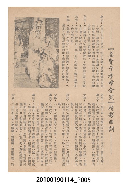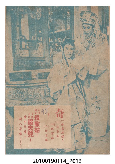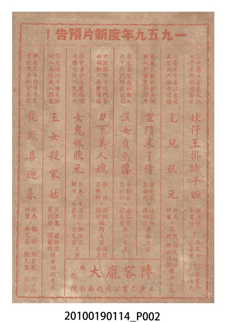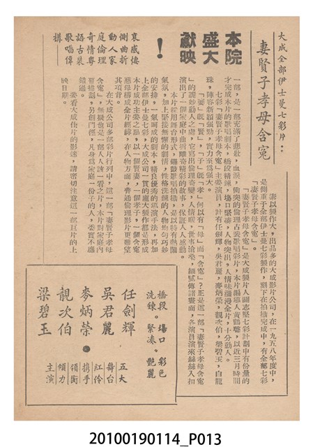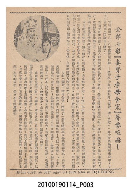 1. 香港電影《妻賢子孝母含冤》於越南上映時的彩色印刷電影本事小冊。正面上有片名「妻賢子孝母含冤」,標明「全部伊士曼七彩」、「悲慘哀慟深刻感人奇情倫理古裝歌唱鉅片」廣告文字,並列出主演演員名單。版面左下角有「大成影業公司」商標,右下角有「美的電版」商標。「三國誌說部分內容一段精彩情節改編!」廣告文字。版面為滿版的手繪圖,版面右下角有「大成影業公司」商標。本事封底為影片廣告,同樣介紹《妻賢子孝母含冤》,標明「奇!」、「名門淑女 殺家姑!」、「多情夫婿 證夫兇!」、「案中有案,耐人尋味」等廣告文字。本事內頁則收錄《妹仔王掛帥平西》、《乞兒狀元》、《空門未了情》、《漢女貞忠傳》、《刀下美人魂》、《玉女殺家姑》、《龍鳳喜迎春》和《文姬歸漢》的電影宣傳。2. 《妻賢子孝母含冤》為大成影業公司1958年出品的粵語彩色戲曲片。影片由黃鶴聲編導,任劍輝、麥炳榮、吳君麗主演。大成影業公司為關家餘及其兄弟於1951年創立的香港電影公司,其作品多交由光藝發行,曾出品一百餘部影片。