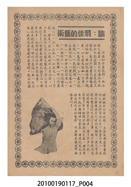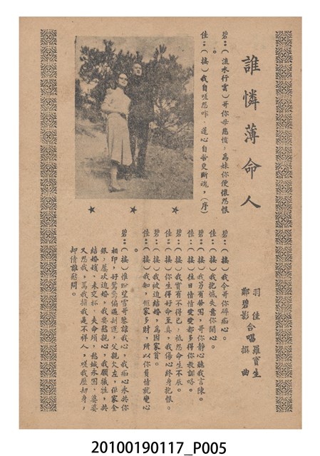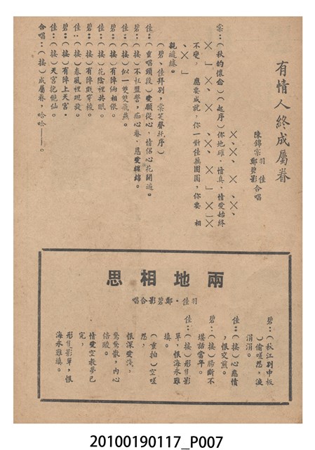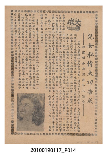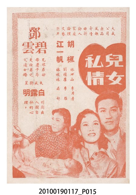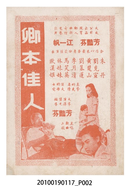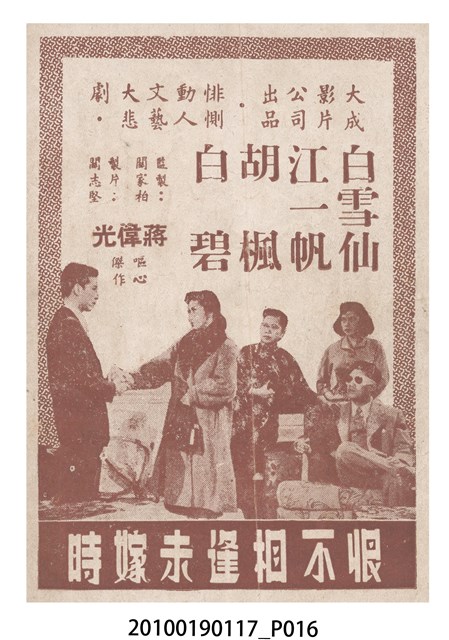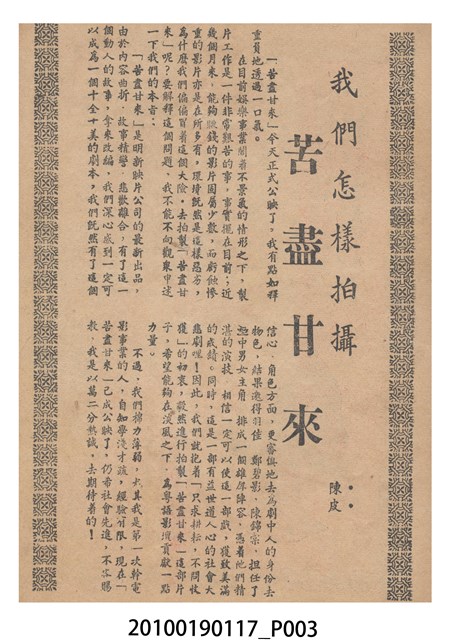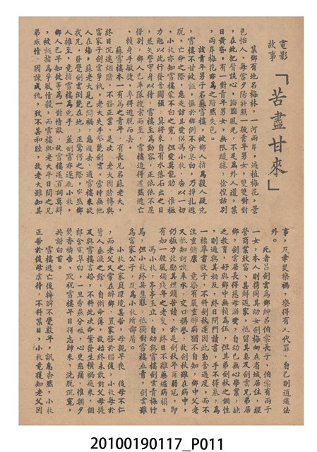 1. 香港粵語片《苦盡甘來》等片宣傳小冊,封面是鄭碧影與羽佳為主的劇照,並標明片名、主演與導演名、「神童羽佳長大成年後第一部小生戲」等字樣,封底則是粵語電影《恨不相逢未嫁時》(1955)的全版電影廣告。內頁包括1. 香港粵語片《卿本佳人》(1955)的電影廣告,《苦盡甘來》的電影本事、導演的話、演技評論、曲詞、電影故事,以及香港粵語片《兒女私情》(1955)的電影介紹及全版廣告。2.《苦盡甘來》為1954年由香港明新影片公司出品,陳皮、謝虹編導,鄭碧影、羽佳、陳錦棠等聯合演出的黑白粵語電影,描述住在鄉下的蘇雪樓被誣告殺人,逃至城中,其女友馮小梅則被迫嫁給他人,蘇和馮二人被拆散,後解開誤會再度重逢的故事。
