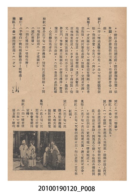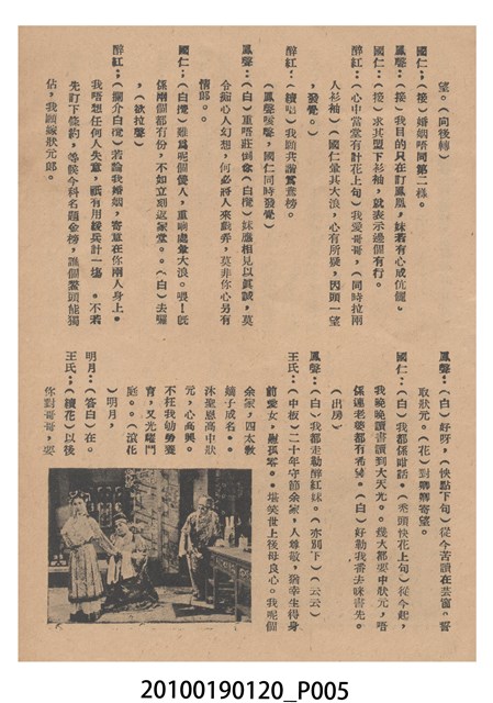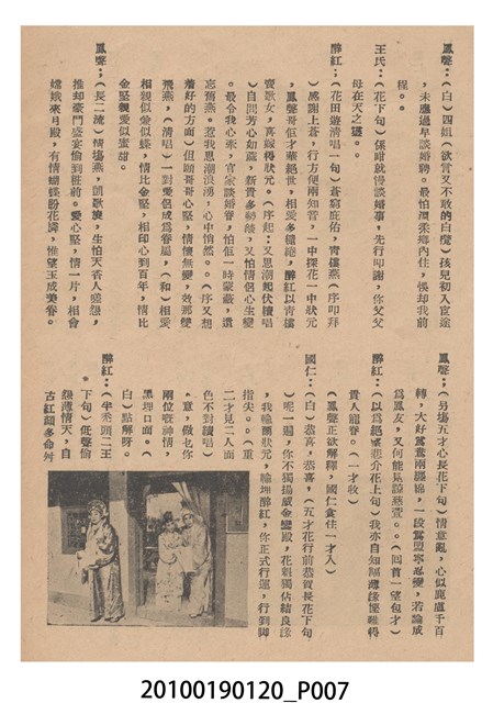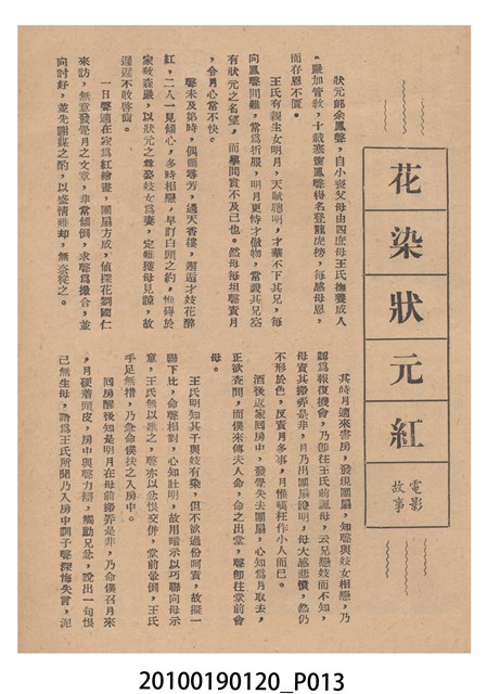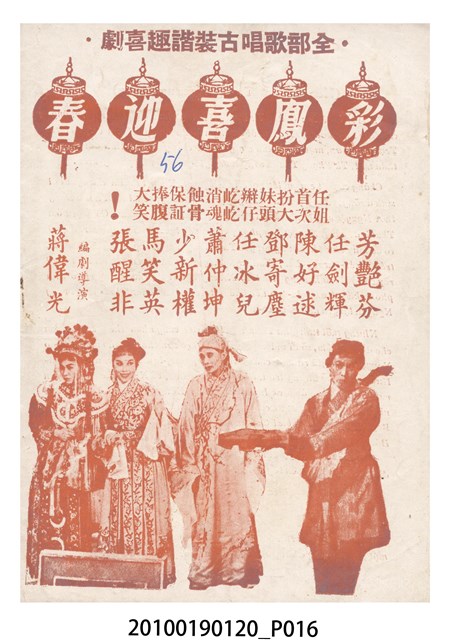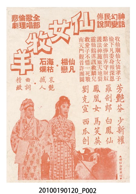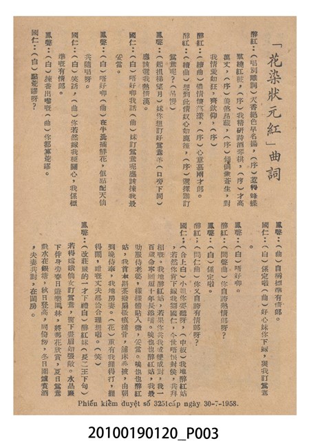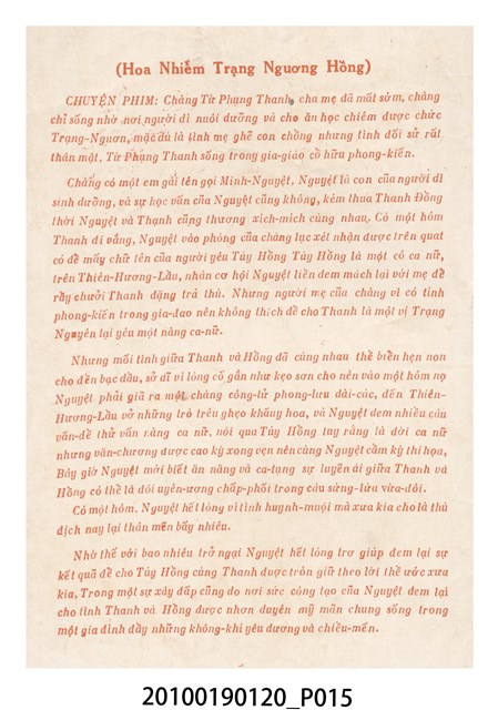 1. 香港電影《花染狀元紅》於越南上映時的雙色印刷電影本事小冊。正面上有片名「花染狀元紅」,版面四周印有劇中主演人形像。本事封底為影片廣告,介紹《彩鳳喜迎春》,標明「全部歌唱古裝諧趣喜劇」、「任姐首次扮大姐頭辮仔屹屹消魂蝕骨保証捧腹大笑!」、「蔣偉光 編劇導演」等廣告文字,並列出主演演員名單。本事內頁則收錄《仙女牧羊》的電影宣傳。2. 《花染狀元紅》為金門影業公司1958年出品的粵語喜劇戲曲片。影片由莫康時導演、羅寶生撰曲,任劍輝、梅綺、梁醒波主演。本片改編自舞台名劇。梅綺1937年正式從影,為1940年代-1950年代香港著名的電影女明星,1957年她參與金門影業公司的工作,監製粵語奇幻片《花神》(1957)與粵語歌唱片《駙馬艷史》(1958)兩部,是其演藝生涯少數的幕後工作。