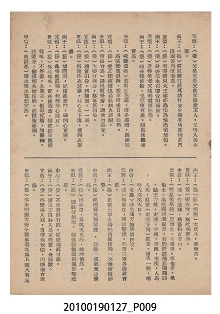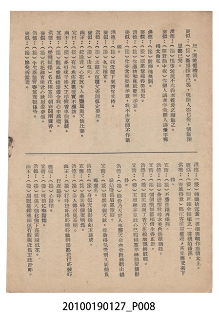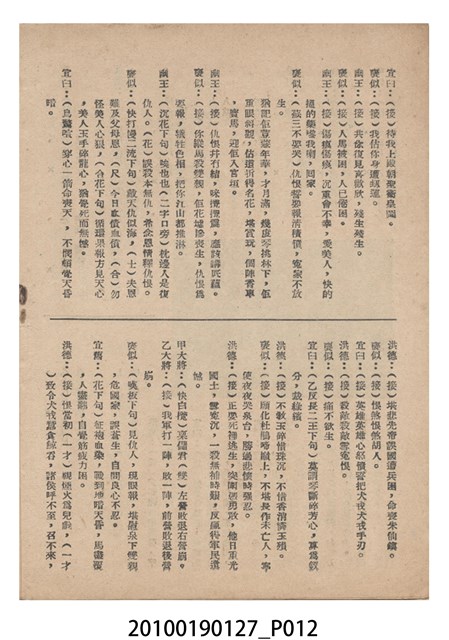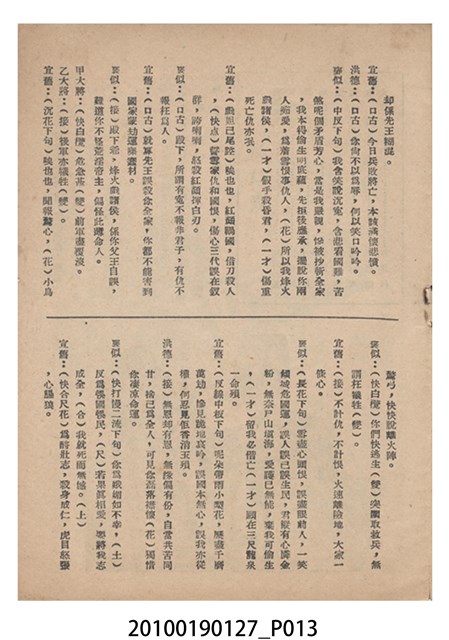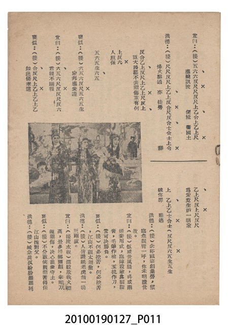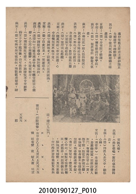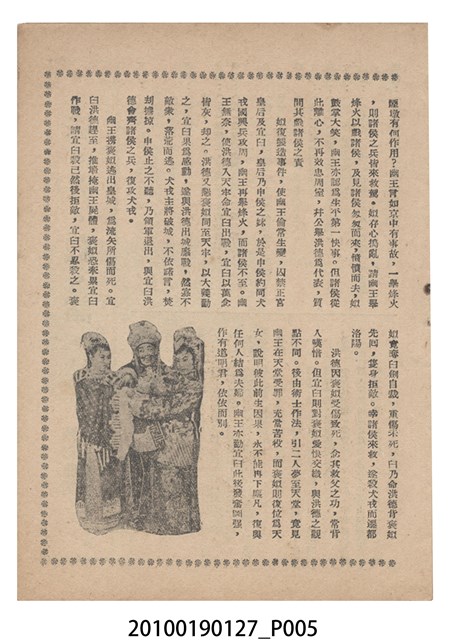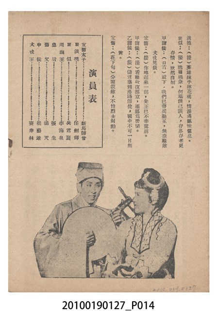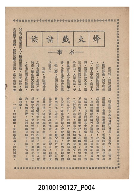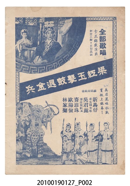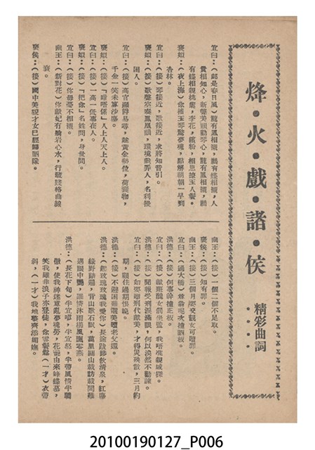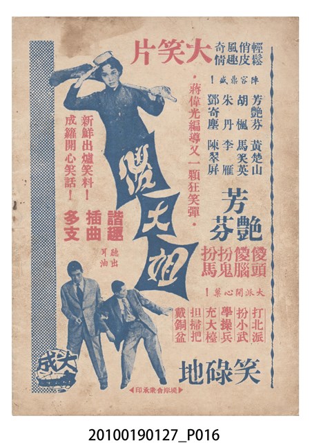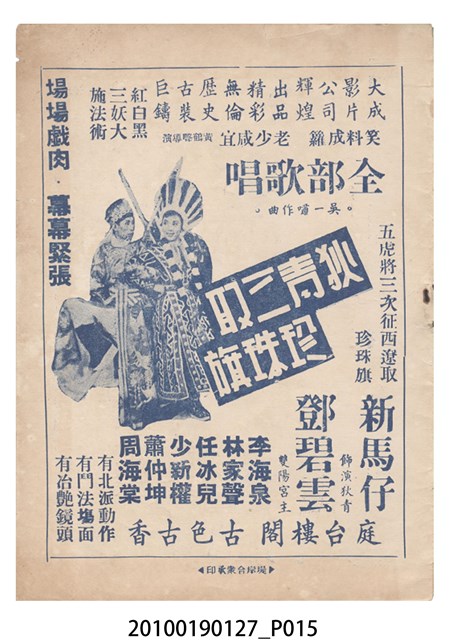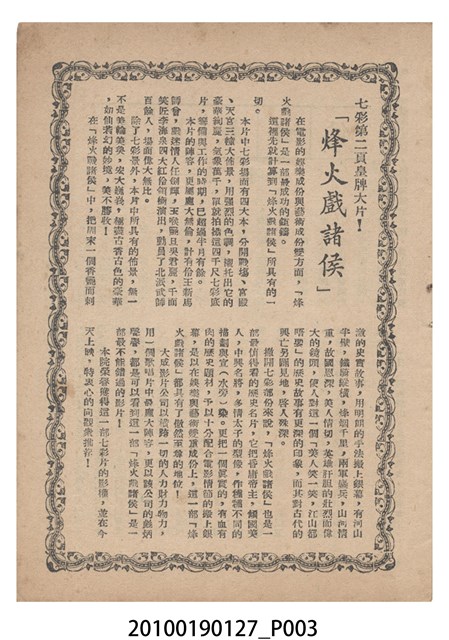 1. 香港粵語片《烽火戲諸侯》等片宣傳小冊,封面是新馬師曾、任劍輝、吳君麗三人的劇照,並標明片名、大成影片公司商標、「局部伊士曼七彩巨片」字樣,封底則是粵語電影《傻大姐》(1956)的全版電影廣告。內頁包括1. 香港粵語片《梁紅玉擊鼓退金兵》(1956)的電影廣告,《烽火戲諸侯》的電影介紹、電影本事、曲詞,以及香港粵語片《狄青三取珍珠旗》(1957)的全版廣告。2.《烽火戲諸侯》為1957年由香港大成影片公司出品,黃鶴聲編導,新馬師曾、任劍輝、吳君麗等聯合演出的黑白粵語戲曲電影,描述褒洪德為救父,獻褒姒給周幽王,褒姒本欲反抗,在得知幽王為殺父仇人後,決定獻身報仇的故事。