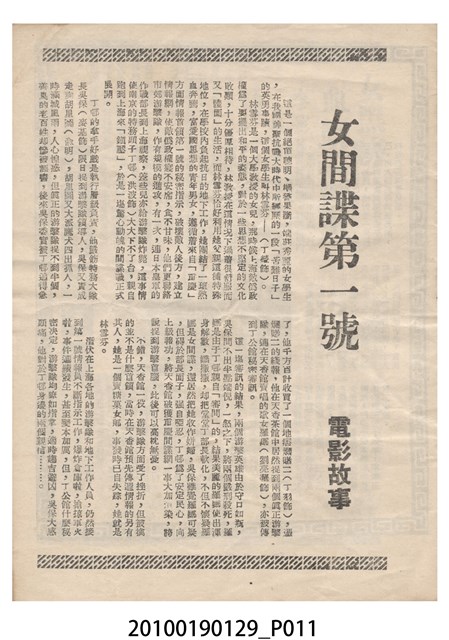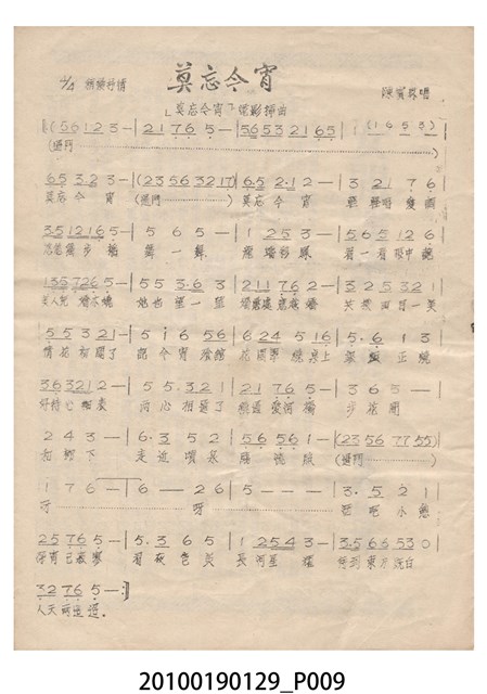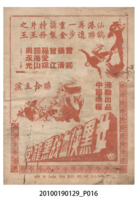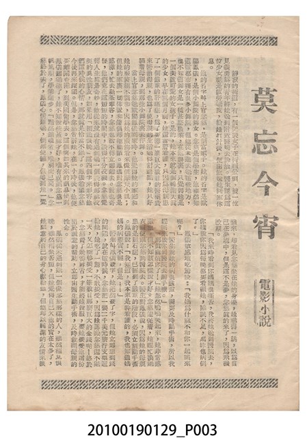 1. 香港粵語片《莫忘今宵》等片宣傳小冊,封面是女主角陳寶珠與男主角呂奇的人形劇照,並標明片名、主演名、「愛情倫理時裝巨片」等字樣,封底則是粵語電影《女黑俠血戰黑龍黨》(女黑俠木蘭花血戰黑龍黨,1966)的全版電影廣告。內頁包括1. 香港粵語片《金鼎游龍》(1966)的電影廣告,《莫忘今宵》的電影小說、歌譜、電影本事,2. 香港粵語片《女間諜第一號》(1965)的電影故事與全版電影廣告,以及香港粵語片《女黑俠血戰黑龍黨》的電影介紹。2.《莫忘今宵》為1966年由香港廿一世紀影業公司出品,黃堯導演,呂奇編劇,陳寶珠、呂奇、何冲等聯合演出的彩色粵語電影,描述上官念慈即將到海外,偶遇歌女歐陽鳳儀,盟生愛意,兩人在歷經誤會與阻饒,終結為連理的故事。