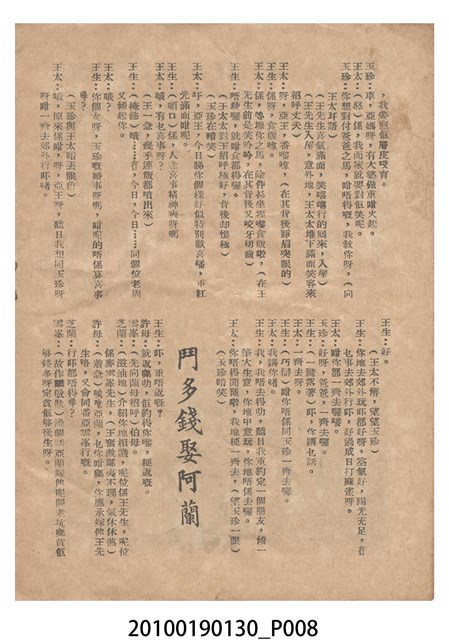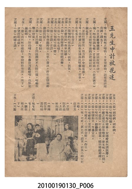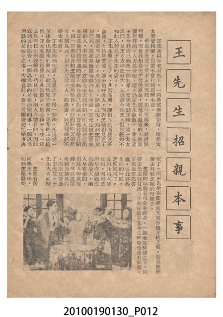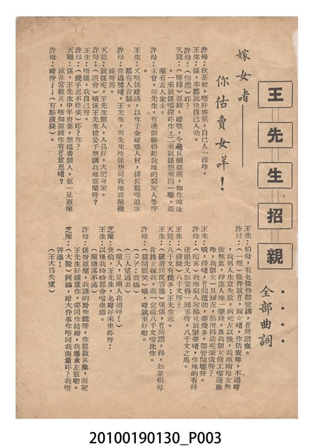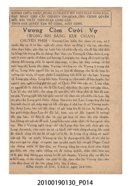 1. 香港電影《王先生招親》於越南戲院上映時的電影本事小冊。彩色印刷的本事封面印有片名「王先生招親」及放大的「囍」字。本事封底為下期上映影片廣告,介紹1954年上映的電影《香銷十二美人樓》,標明「十二樓頭 ㄚ角終老」、「多少恨夢魂中」與「兩天王星 分飾四角 新穎橋段 兩代恩怨」等宣傳廣告詞,以及主演演員「芳艷芬」、「任劍輝」的名字。本事內頁則有《王先生招親》的故事、全部曲詞與劇照,以及《冤枉相思》電影廣告。2. 香港電影《王先生招親》由玉聯影業公司於1959年出品。該片由黃鶴聲執導,新馬師曾、鄧碧雲、譚蘭卿、雪豔梅、司馬華龍、陶三姑等領銜主演。影片人物取材自葉淺予所著連環漫畫《王先生》,《王先生》發行於1930年代上海,是環繞著身材矮短的王先生、他的太太與女兒發生的800組連載喜劇漫畫,該漫畫於上海時期就已曾被改編為電影,玉聯影業曾發行四部王先生系列電影,包括《王先生行正桃花運》(1959)、《王先生著錯老婆鞋》 (1959)、《王先生騎正胭脂馬》(1959)、《王先生招親》(1959),皆由新馬師曾飾演這位經典逗趣的喜劇主角。