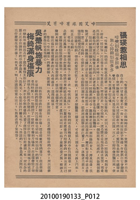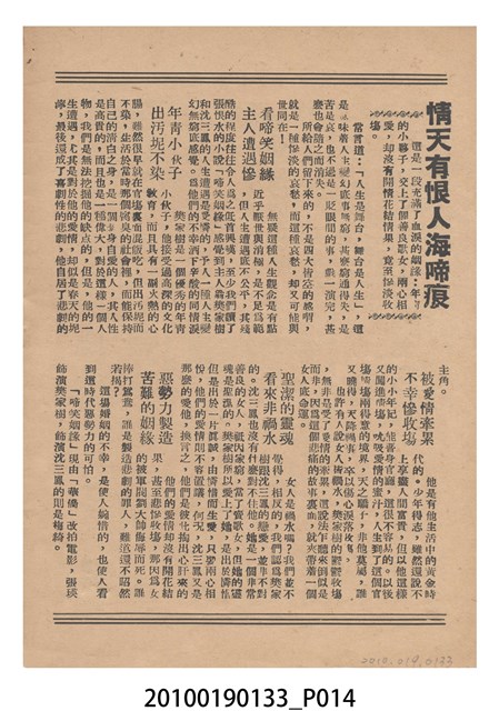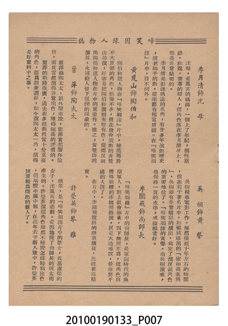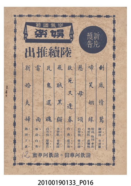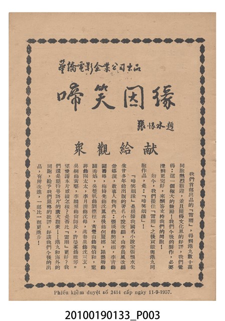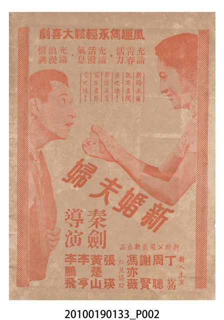 1. 香港粵語片《啼笑姻緣》等片宣傳小冊,封面是 吳楚帆與羅艷卿的人形劇照,並標明片名、主演名、「張恨水名小說家改編」字樣,封底則是新片預告。內頁包括1. 香港粵語片《新婚夫婦》(1956)的電影廣告,《啼笑姻緣》的電影介紹、曲詞、角色介紹、電影本事等,以及ovaltine阿華田的全版廣告。2.《啼笑姻緣》為1957年由香港華僑電影企業公司出品,李晨風編導,吳楚帆、李清、張瑛、羅艷卿等聯合演出的黑白粵語電影,描述樊家樹幫助歌女沈鳳喜求學、生活,兩人互生情素,經歷難關、失憶等關卡的愛情故事。