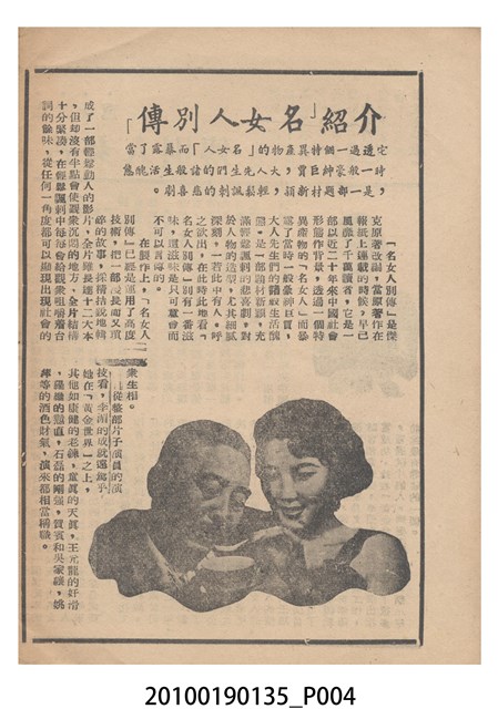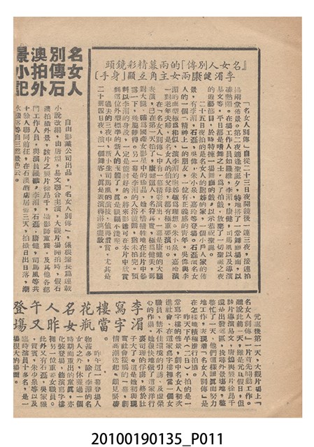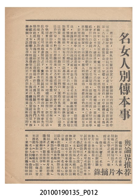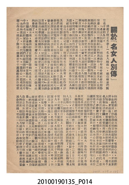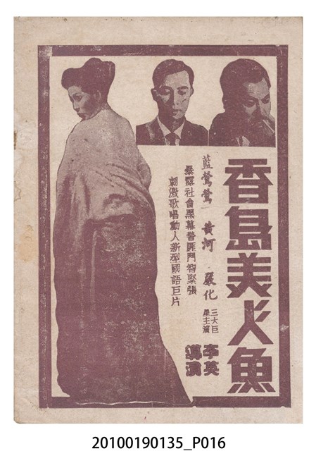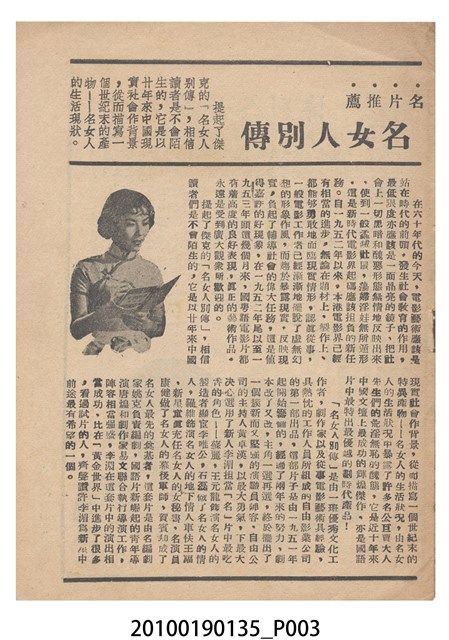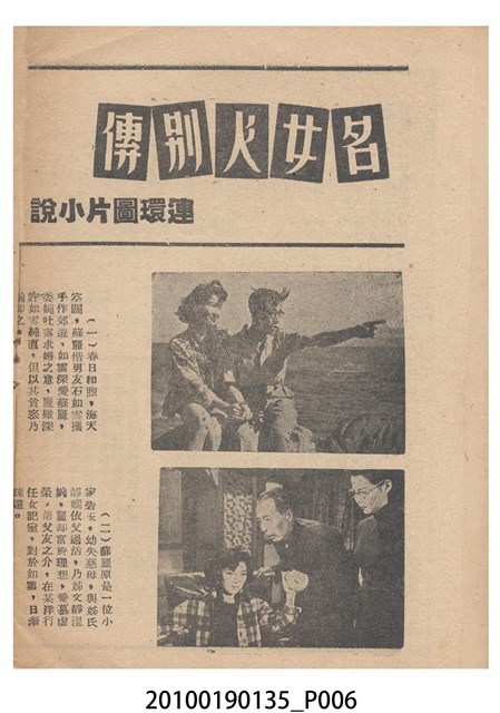 1. 香港電影《名女人別傳》於越南戲院上映時的電影本事小冊。以黃色作為底色、雙色印刷的本事封面印有片名「名女人別傳」字樣。本事封底為下期上映影片廣告,介紹香港電影《香島美人魚》,標明「暴露社會黑幕警匪鬥智緊張」、「刺激歌唱動人新型國語巨片」等廣告文案,並列出導演李英與主演演員名單。本事內頁則有《名女人別傳》故事與介紹、新人李湄的介紹,由劇照與劇情構成的連環圖片小說等,以及《天堂美女》、《怨女情癡》電影廣告。2. 香港電影《名女人別傳》由自由影業公司於1953年出品。是由易文、唐煌執導的國語劇情片,由李湄、謝之、羅維等人主演。自由影業公司為黃卓漢於1952年創立的公司,本片為該公司第一部出品的影片。黃卓漢結束香港事業後在臺灣成立第一影業公司,並於1993年獲得第三十屆金馬獎終身成就獎。