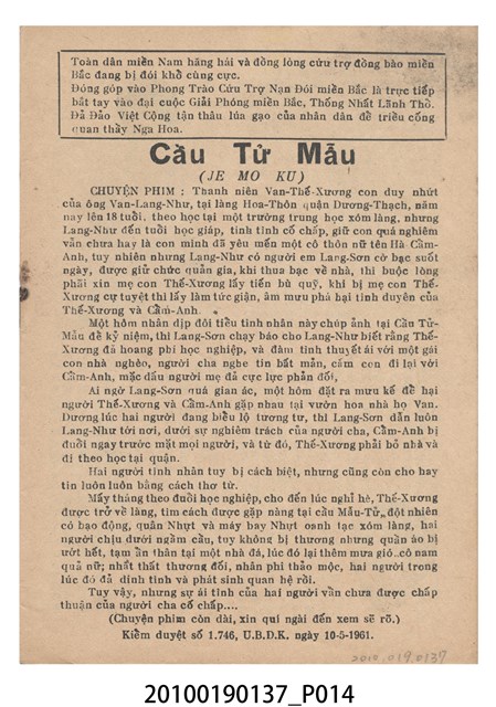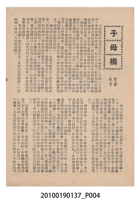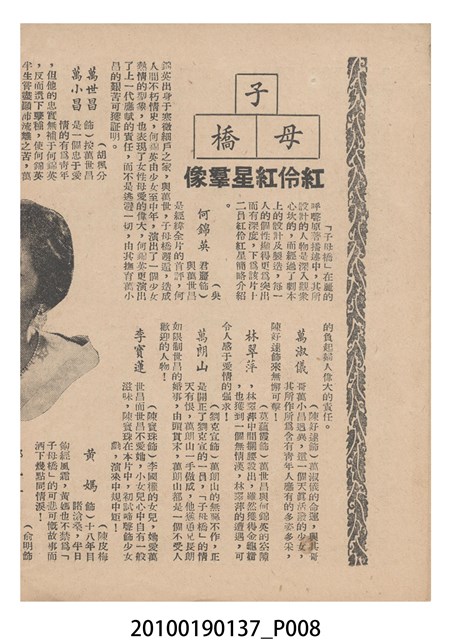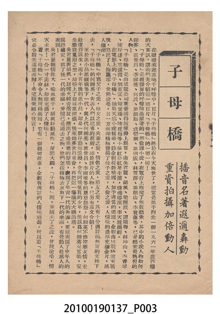 1. 香港電影《子母橋》於越南戲院上映時的電影本事小冊。以紅綠雙色印刷的本事封面印有片名「子母橋」,以及主演演員名單。本事封底為下期上映影片廣告,介紹粵語武俠片《猩猩王大戰黃飛鴻》,標明「午夜出沒傷人塌屋 搶掠姦淫婦女喪膽」、「橫行鄉井勾結土豪」、「好財劫色無惡不作」等廣告字樣,並列出導演與主演演員名單。本事內頁則有《子母橋》故事與介紹、紅伶紅星群像等內容,以及《阿福當兵》、《冤枉相思》電影廣告。2. 香港電影《子母橋》由龍成影業公司於1961年出品。是由珠璣執導的粵語劇情片,由吳君麗、胡楓、梁醒波主演。《子母橋》內容敘述富家子萬世昌與村女何錦英相戀,萬世昌叔父因垂涎何錦英之美色而在萬世昌父親面前多番挑撥,二人被迫分離而何錦英卻懷有身孕的故事。該片分成上下兩集,皆發行於1961年,此二部影片也是龍成影業出品的唯二電影。