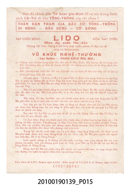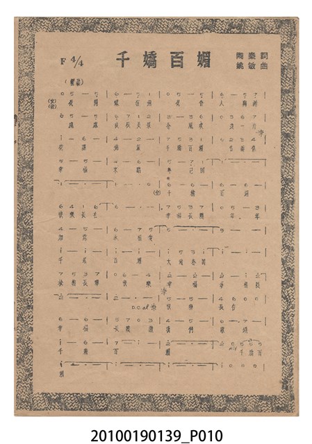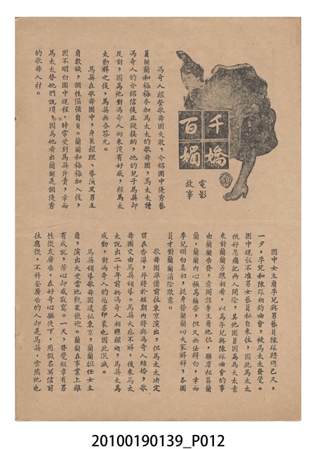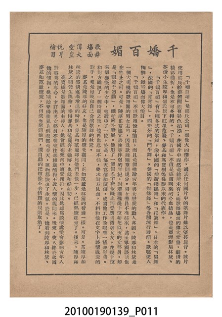 1. 香港電影《千嬌百媚》於越南戲院上映時的電影本事小冊。以灰色作為底色的本事封面印有片名「千嬌百媚」、法文的片名翻譯「La Belles」與邵氏電影公司商標,下方搭配有一排舞蹈中的小人插繪。本事封底為下期上映影片廣告,介紹同樣由邵氏電影公司出品的《倩女幽魂》,標明「邵氏七彩古裝巨鑄」、「參加美法影展飲譽國際影壇」等廣告字樣,以及導演與主演演員名單。本事內頁則有《千嬌百媚》故事與介紹,〈祝福〉、〈蜘蛛網〉、〈昨夜等怪夢〉、〈心花朵朵開〉、〈千嬌百媚〉等多首電影歌詞與曲譜、演員表和其歌舞造型劇照,以及《後門》電影廣告。2. 香港電影《千嬌百媚》由邵氏兄弟有限公司於1961年出品。是由陶秦執導的國語歌舞劇電影,由林黛、陳厚、 范麗主演。陶秦(1915-1969)是一名出生於上海後至香港執導國語片的導演與電影歌曲作詞人,他一生編導影片40餘部,多為文藝片與歌舞片,此部《千嬌百媚》讓陶秦於1962年獲第一屆臺灣電影金馬獎最佳導演獎。