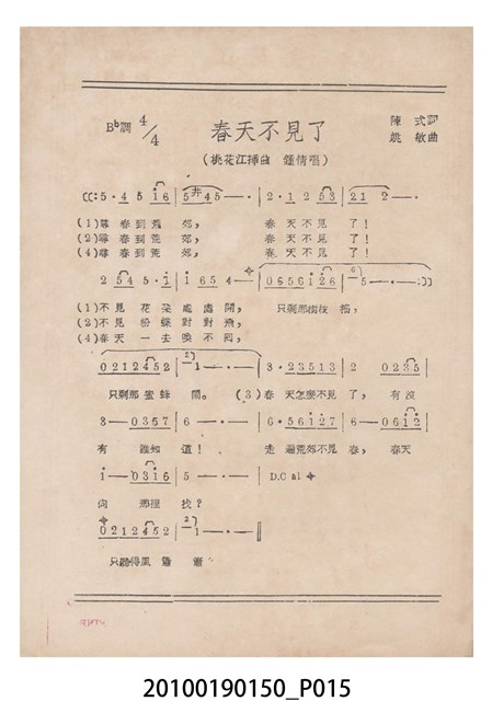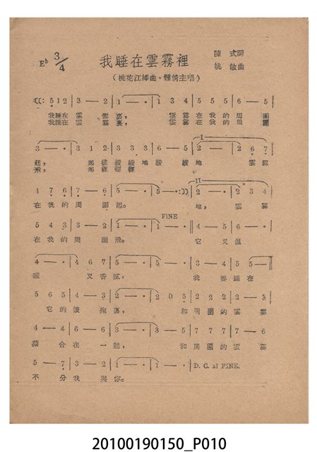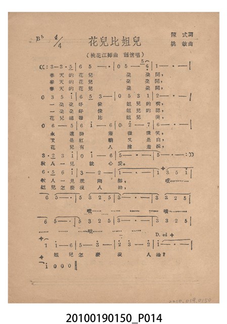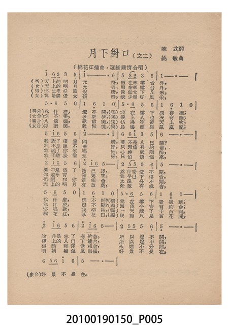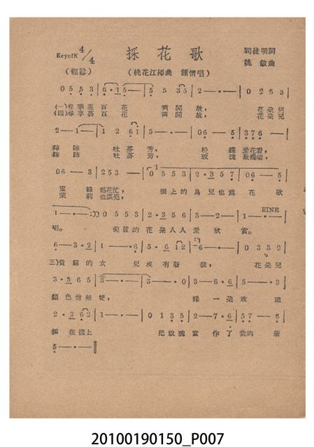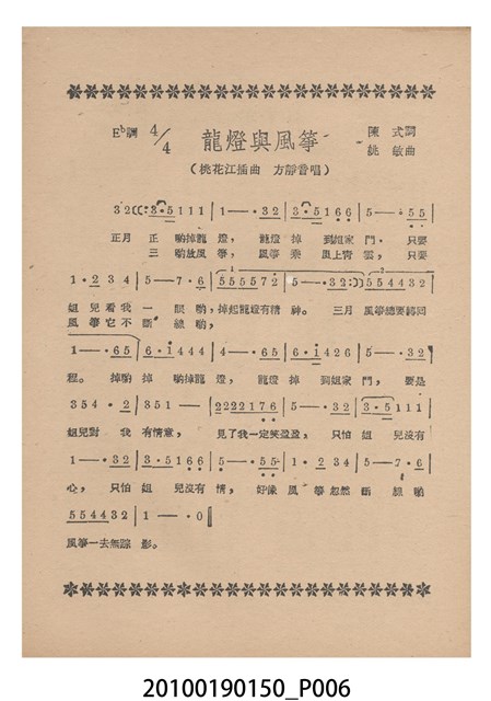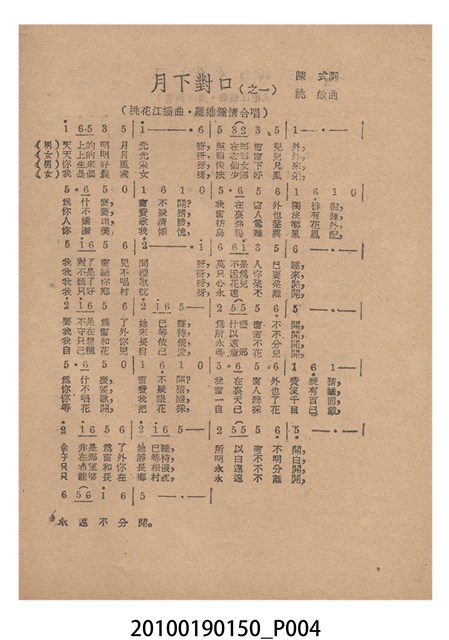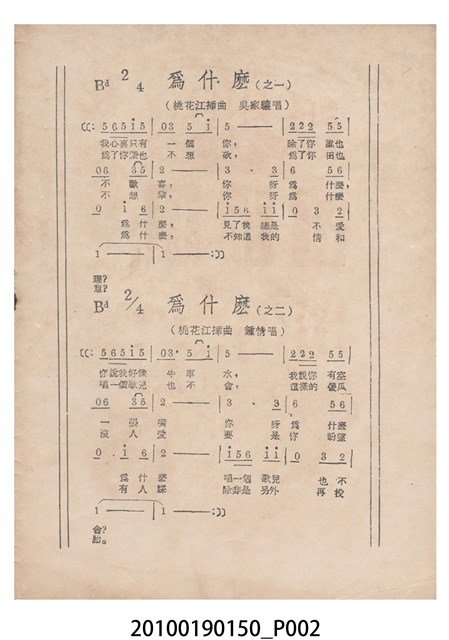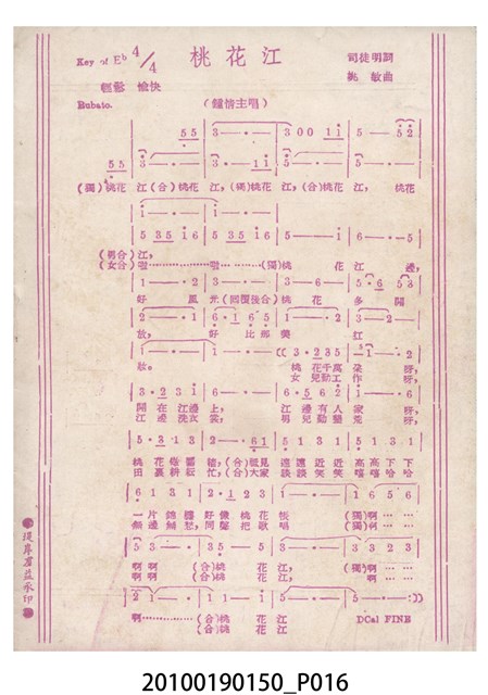 1. 香港國語片《桃花江》電影歌譜,封面是女主角鍾情的人形劇照,並標明片名、主演名、「新華公司出品輕鬆歌唱喜劇」、「全片新歌十四闋」等字樣,封底則是《桃花江》主題曲的歌譜。內頁包括《桃花江》的歌譜、電影本事。2.《桃花江》為1956年由香港新華影業公司出品,張善琨、王天林導演,陳蝶衣編劇,羅維、鍾情、陳厚等聯合演出的黑白國語歌唱電影,描述黎明在桃花江畔採集民歌,被外號「野貓」的村姑金麗蓉的歌聲所吸引,後因戰事爆發,歌女逃難到香港,在黎明的提攜下登台演唱,一舉成名的故事。
