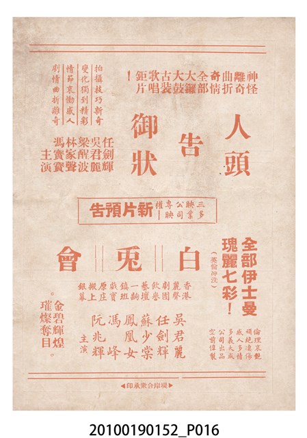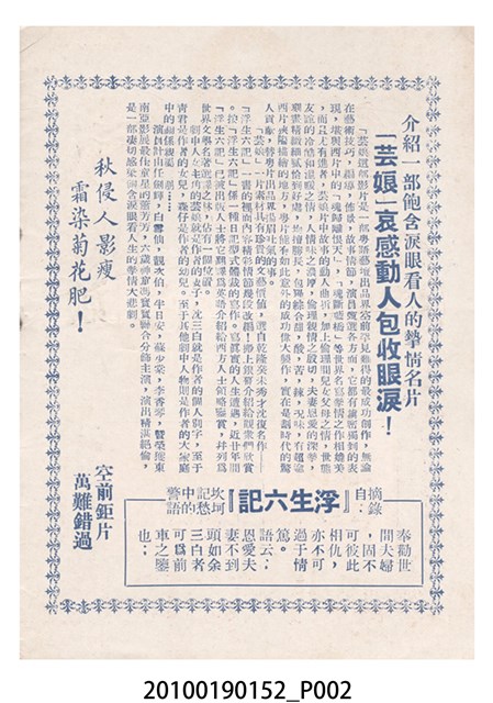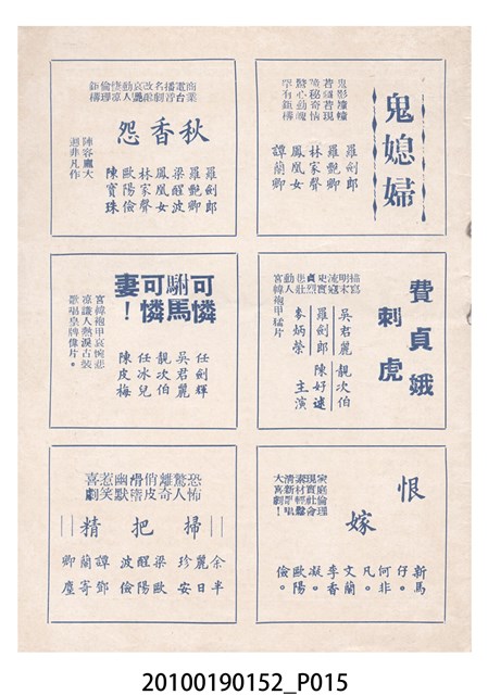 1. 香港電影《芸娘》於越南戲院上映時的電影本事小冊。彩色印刷作的本事封面印有片名「芸娘」以及「三多影業公司專映權」字樣。本事封底為下期上映影片廣告,介紹由吳君麗與任劍輝主演的《人頭告御狀》、《白兔會》二部電影。本事內頁則有《芸娘》故事與介紹、精彩曲詞與工尺譜、演員表,以及其他將上映的電影廣告《鬼媳婦》、《費貞娥刺虎》、《恨嫁》、《秋香怨》、《可憐駙馬可憐妻》、《掃把精》。2. 香港電影《芸娘》由立達影業公司於1960年出品。該片由珠璣執導,任劍輝、白雪仙、半日安、靚次伯、蘇少棠、任冰兒等領銜主演。立達影業公司為活躍於1950至60年代的香港電影公司,出品《兩地相思》(1955)、《芸娘》、《楊門女將告御狀》(1961)等50餘部影片。