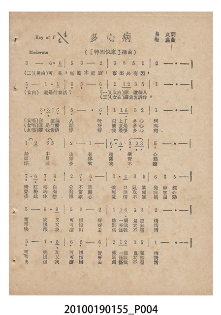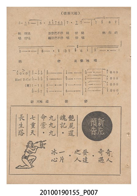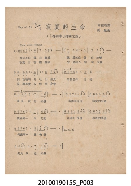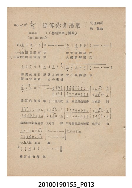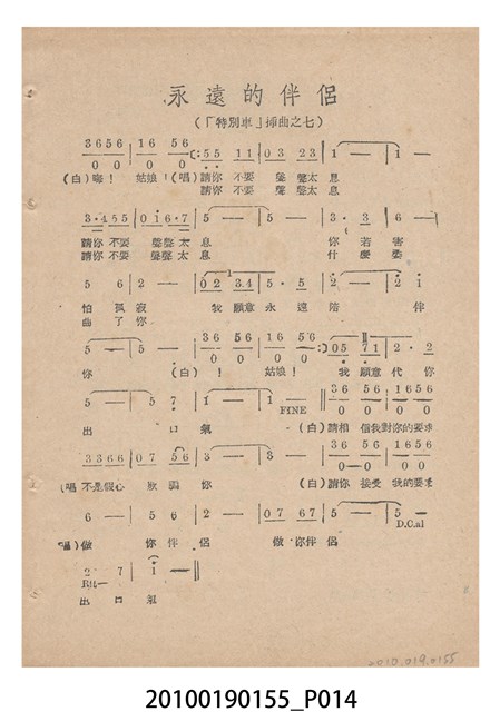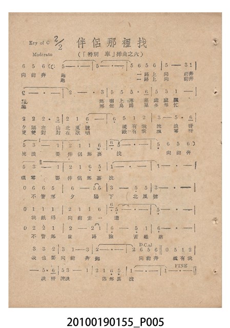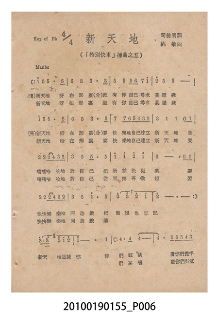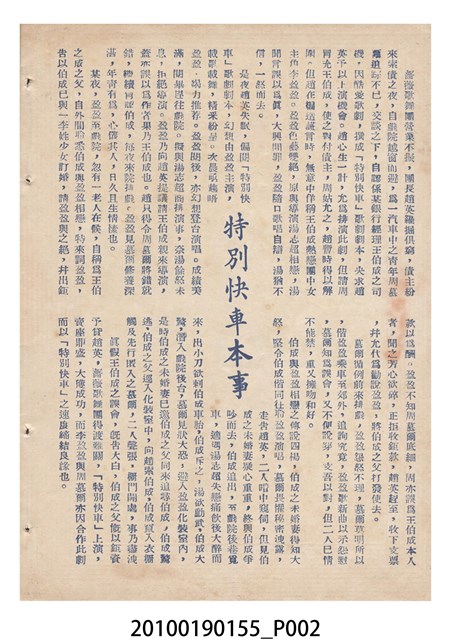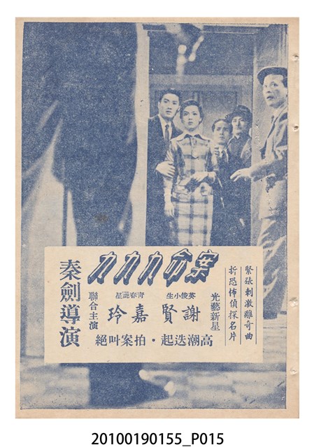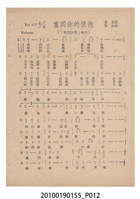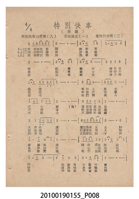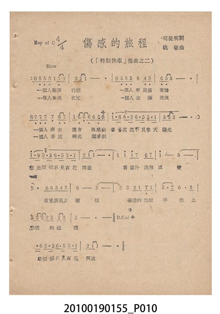 1. 香港國語片《特別快車》電影歌集,封面是女主角鍾情的人形劇照,並標明片名、「歌集」字樣,封底則是粵語電影《奇人奇遇》(1956)的全版電影廣告。內頁包括《特別快車》的電影本事、歌譜,以及香港粵語片《九九九命案》(1956)的全版廣告。封面左下另有原子筆簽名「陳光輝」字樣。2.《特別快車》為1956年由香港新華影業公司出品,易文編導,鍾情、陳厚、洪波等聯合演出的黑白粵語電影,描述周慕爾撰歌劇《特別快車》,歌舞團團長要求周慕爾冒充銀行家王伯成,助他應付債主,才願打硬排演新劇,周慕爾與歌舞團台柱李盈盈日久生情,令周的未婚妻誤會其變心,後真相大白,銀行家貸款給劇團,歌劇亦成功上演,周慕爾與李盈盈締結良緣。