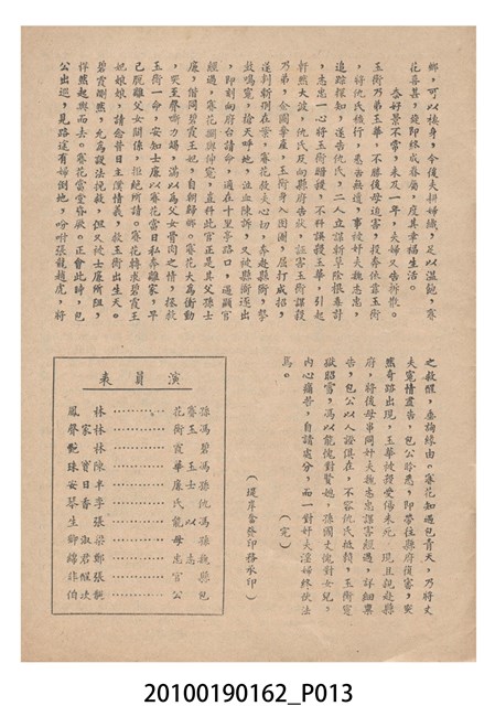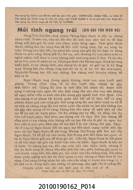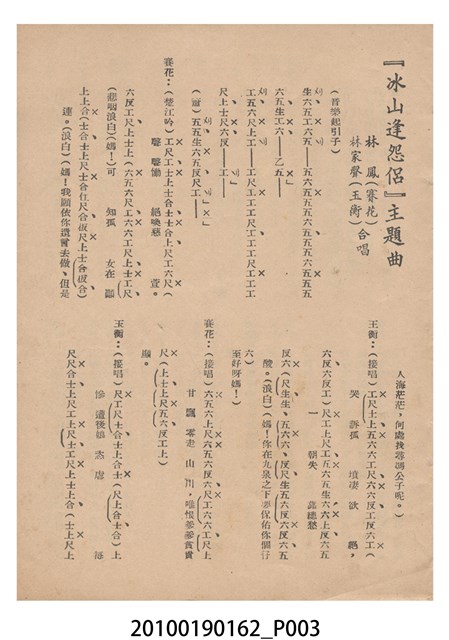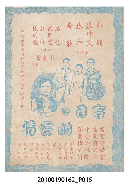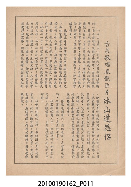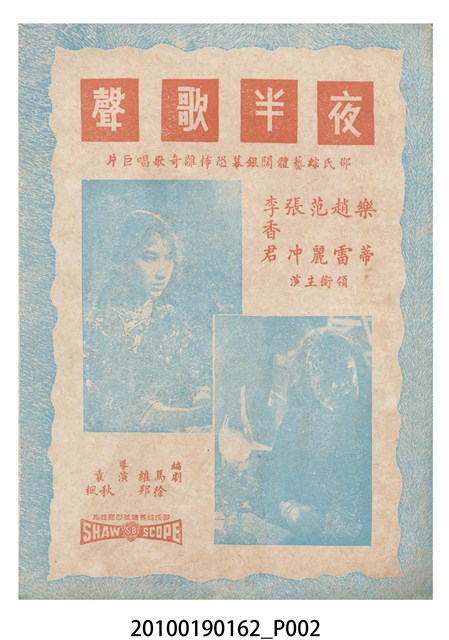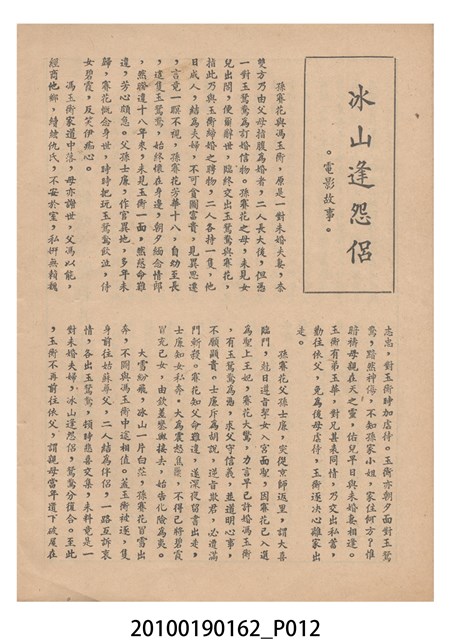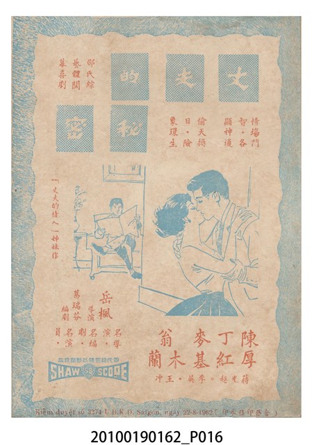1. 香港電影《冰山逢怨侶》於越南戲院上映時的電影本事小冊。以藍色作為底色的本事封面印有片名「冰山逢怨侶」與邵氏電影公司的商標。本事封底為下期上映影片廣告,介紹另一部邵氏出品的喜劇電影《丈夫的秘密》,標明「情場鬥智.各顯神通」、「邵氏綜藝體闊幕喜劇」與「偷天換日.險象環生」,以及陳厚、丁紅等主演演員名單。本事內頁則有《冰山逢怨侶》故事與介紹,電影主題曲的歌詞、工尺譜與演員表,以及《夜半歌聲》、《盲目的愛情》電影廣告。2. 香港電影《冰山逢怨侶》由邵氏兄弟有限公司於1961年出品。是由蔣偉光執導,林鳳、林家聲、林艶、陳寶珠領銜主演的粵語戲曲電影。蔣偉光原為粵劇戲班開戲師爺,由於執導的影片長期賣座,在影圈有「財神導演」的外號。其電影生涯始於美國,在大觀美國分廠任導演,執導了《一笑博郎心》(1946)、《海角情鴛》(1947)等影片,戰後回港執導的首部影片為粵語片《怕見舊情郎》(1947)。1956年粵語戲曲片興起,蔣脫離大成以自由身執導影片,所執導的粵劇戲曲片名作包括《胡不歸》(1958)、《枇杷巷口故人來》(1959)等,1961年開始為邵氏兄弟公司粵語片組執導影片,1940至1970的職涯年間他一共執導了160餘部電影。