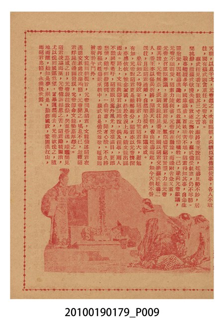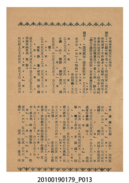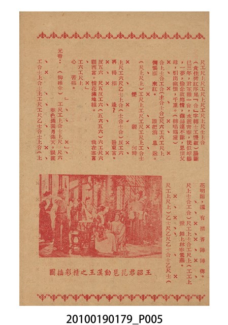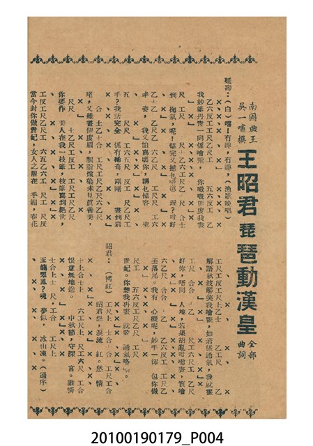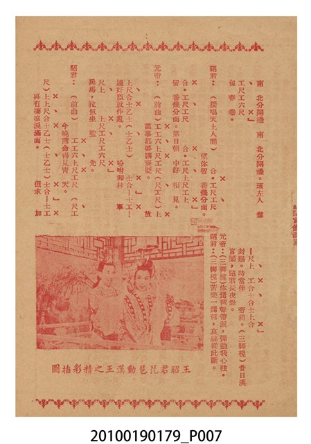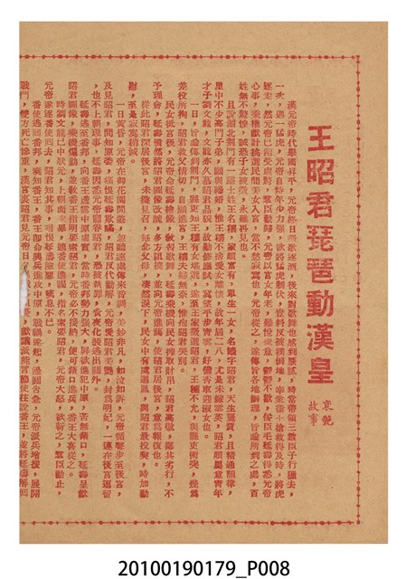 1. 香港電影《王昭君琵琶動漢王》於越南戲院上映時的電影本事小冊。以紅色和藍色雙色印刷的本事封面印有片名「王昭君琵琶動漢王」、「全部歌唱」的廣告文字。本事封底為下期上映影片廣告,介紹香港粵語影片《桂枝告狀》(1956),標明「全部歌唱」、「港九舞台連滿二十九場戲寶上鏡」與「兩院快將盛大聯映」,以及「唐滌生先生原著名劇改編」等廣告字樣,並列出主演演員名單。本事內頁則有《王昭君琵琶動漢王》故事與介紹,該片的全部曲詞與工尺譜,劇照插圖以及演員表。2. 香港電影《王昭君琵琶動漢王》由大聯影業公司於1956年出品。該片是由陳皮執導,新馬師曾、鄧碧雲、賽珍珠領銜主演的粵語戲曲電影。大聯影業公司是活躍於1940-60年代的香港電影公司,早期出品粵語戲曲片,晚期則拍製各種類型的劇情片,曾出品《胭脂八陣圖》(1948)、《王昭君琵琶動漢王》、《獅王之王》(1971)等80餘部電影。