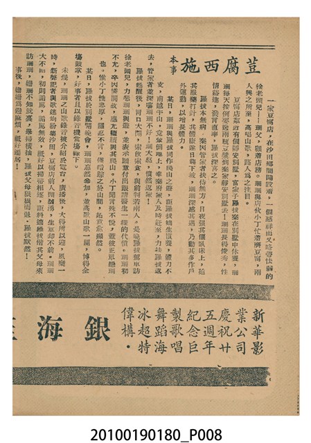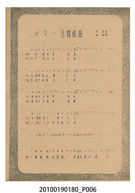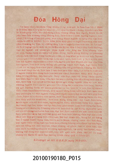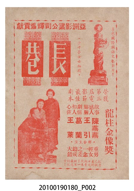 1. 香港國語片《荳腐西施》等片宣傳小冊,封面由人形劇照和紅藍雙色為主的插圖構成,並標明「荳腐西施」、「農村背景題材新穎歌唱國語巨片」、領銜主演林翠、金峰、「越華公司映權」字樣,封底則為《銀海笙歌》(1958)的廣告,內頁包括《荳腐西施》的電影故事、曲詞、演員林翠介紹、越南語簡介,以及新片《長巷》(1956)與《江湖恩仇》(1958)的電影介紹與廣告。2. 《荳腐西施》為1959年由香港新華影業公司出品,卜萬蒼導演,林翠、金峰、吳家驤、馬力、林靜、蔣光超、尤光照等人主演的時裝國語歌唱片,描述珊珊在父親於沙田的豆腐店工作。珊珊性格開朗,唱得一口動聽的山歌,富家子秦羅拔身體孱弱,於沙田養病,珊珊每天送豆漿到羅拔住所,為他帶來不少歡樂,羅拔身體亦逐漸康復。珊珊因在舞會中高歌一曲知名度大增,為逃避騷擾而與店員小丁遊山玩水,感情日增,其後決定隨父與阿丁另擇新址,繼續經營豆腐店的故事。