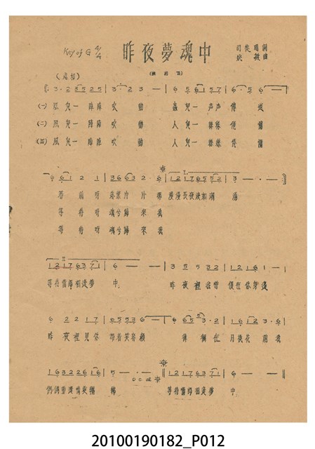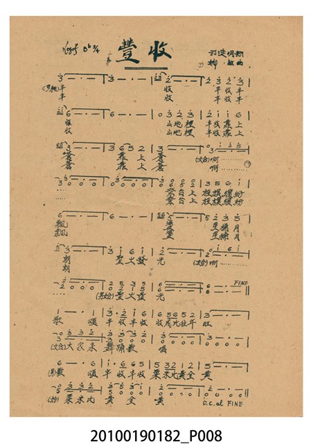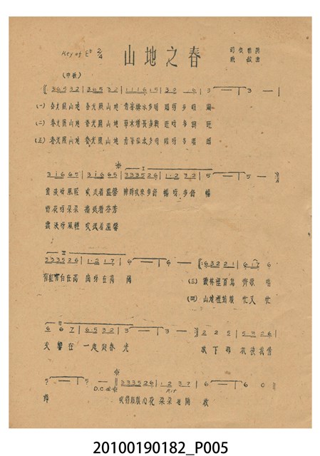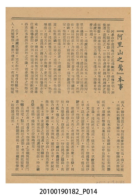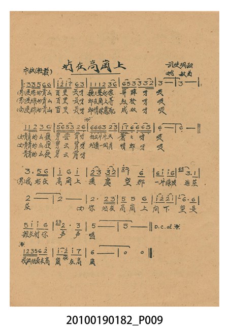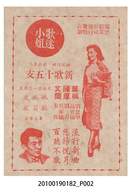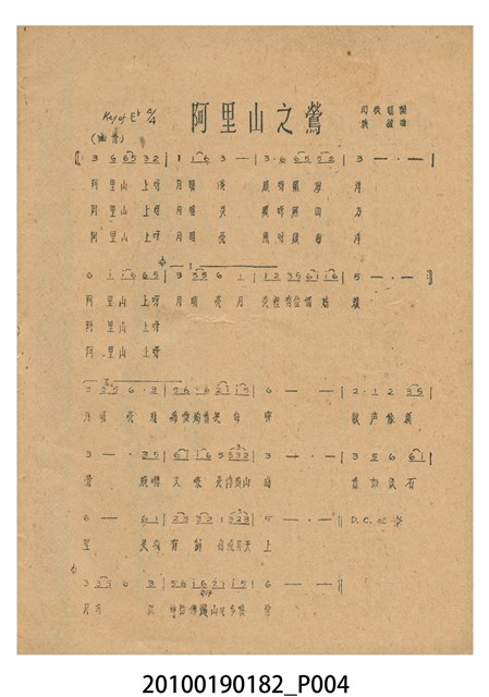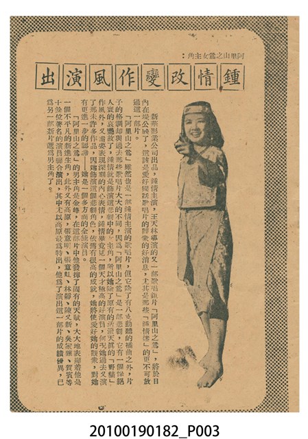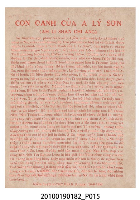 1. 香港電影《阿里山之鶯》於越南戲院上映時的電影本事小冊。以綠色作為底色的本事封面印有片名「阿里山之鶯」,以及「新華公司出品至情至聖歌唱文藝巨片」的廣告文字。本事封底為下期上映影片廣告,介紹電懋公司出品的香港國語電影《天長地久》,標明「電懋公司 悲歡離合 至情至聖 文藝巨片」等廣告字樣,以及主演演員名單。本事內頁則有《阿里山之鶯》故事與介紹,電影歌曲〈阿里山之鶯〉、〈山地之春〉、〈月桃花〉、〈愛的渦流〉、〈豐收〉、〈站在高崗上〉等多首歌詞與曲譜,以及女主角鍾情的介紹;內頁則有《歌迷小姐》的電影廣告。2. 香港電影《阿里山之鶯》由新華影業公司於1957年出品。該片是由王天林執導,鍾情、金峰、高原、陳又新、賀賓等人聯合主演的愛情歌唱國語電影,該片為新華影業赴臺灣取景的電影,劇中插曲由司徒明作詞,姚敏作曲,姚莉演唱。劇情講述山地美女傅婀娜與漢人趙虎相戀,拒絕同族麥羅斯的追求,導致趙虎遇害,傅婀娜疑是麥羅斯所為,痛不欲生。傅婀娜於豐收慶典上被奉為聖女主祭,發現陪同獻祭的聖男竟是麥羅斯,悲憤莫名,投海殉情的故事。