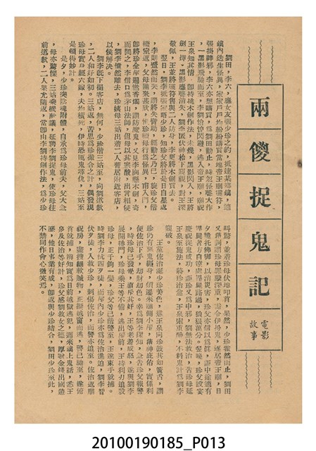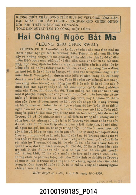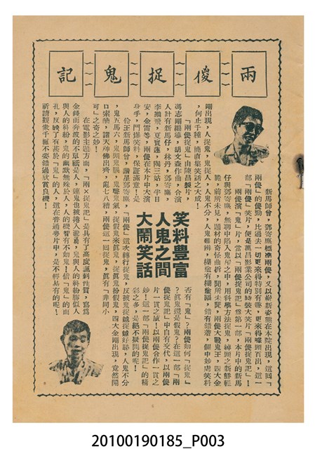 1. 香港電影《兩傻捉鬼記》於越南戲院上映時的電影本事小冊。雙色的封面印有片名「兩傻捉鬼記」與領銜主角等人的人形劇照。本事封底為下期上映影片廣告,介紹粵語片《紫釵記》,標明「本片於去年度獲選全港最高票房紀錄十大名片之一本院榮獲影權」、「任白波合作以來最得意之傑作」、「李鐵導演」、「任劍輝 白雪仙 梁醒波」等人主演;內頁則有《鬼馬福星》、《鴛鴦福祿》的電影廣告。2. 香港電影《兩傻捉鬼記》為萬昌影業公司於1959年出品的粵語歌唱喜劇片,由李壽祺、馮志剛編導,胡文森撰曲,新馬師曾、林丹、鄧寄塵等領銜主演。新馬師曾與鄧寄塵於1958年開始合作「兩傻」系列,人物角色通常設定為在社會底層生活的兩人拍擋,以心地善良、單純但同時又有世俗慾望的形象,獲得觀眾好評,於1950年代末爆紅直至1960年代中期。