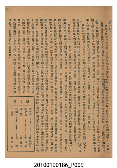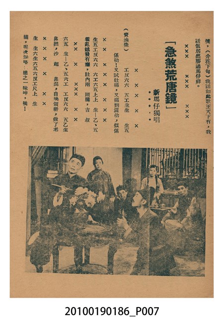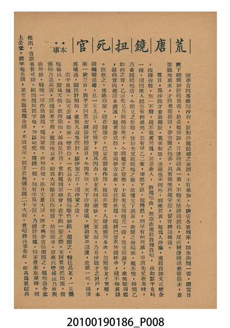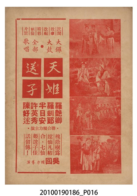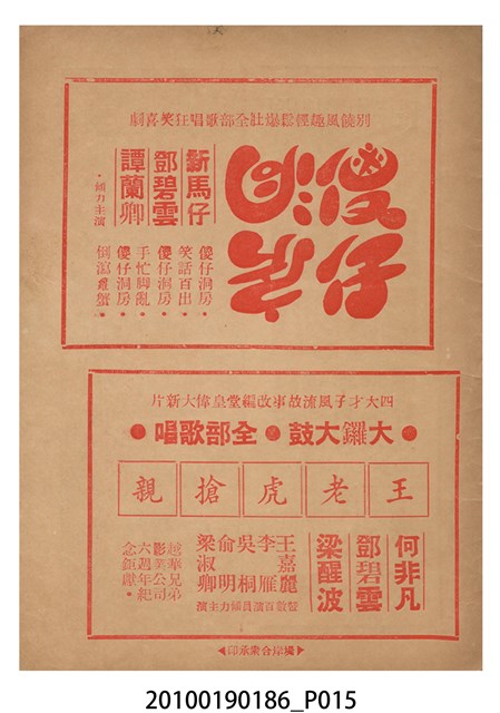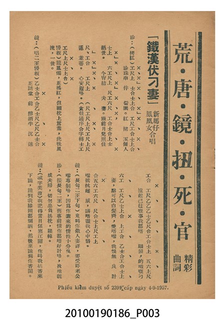 1. 香港粵語片《荒唐鏡扭死官》等片宣傳小冊,封面由綠色單色印刷劇照和紅色標題構成,標題題有「荒唐鏡扭死官」字樣,封底則為《天姬送子》(1957)的廣告,內頁包括《荒唐鏡扭死官》的電影故事、曲詞、演員表,以及《陳宮罵曹》(1957)、《傻仔洞房》(1957)、《王老虎搶親》(1957)的電影廣告。2. 《荒唐鏡扭死官》為1957年由香港雲峰影業公司出品,黃鶴聲(即黃金印)導演,新馬師曾、鳳凰女、鄧寄塵、李海泉、黃楚山,周吉、香海、袁小田等人主演的古裝香港粵語片,描述荒唐鏡仗義幫助農戶王九叔父,與地主沙超及其師爺陳夢吉鬥法,荒唐鏡佈下王九自殺的煙幕,指沙超迫債害死王,令沙超入獄。沙超出獄後誤殺王,在陳夢吉的雄辯下,官府不知如何判決,鏡亦無計可施的故事。