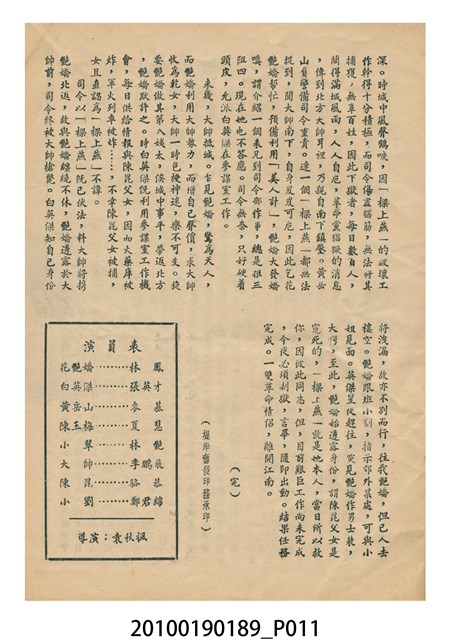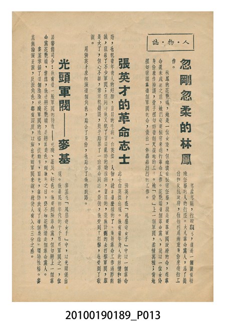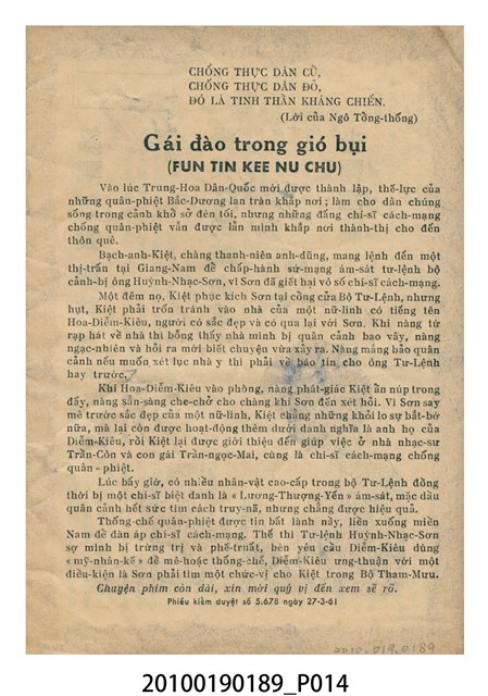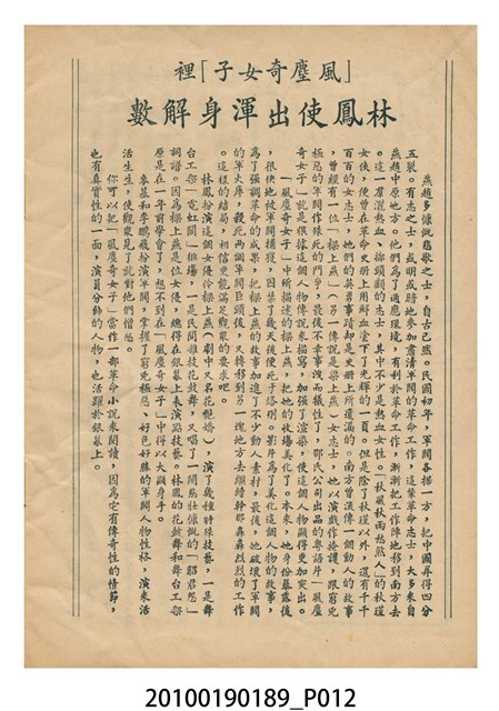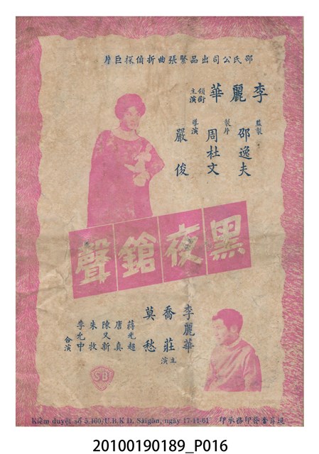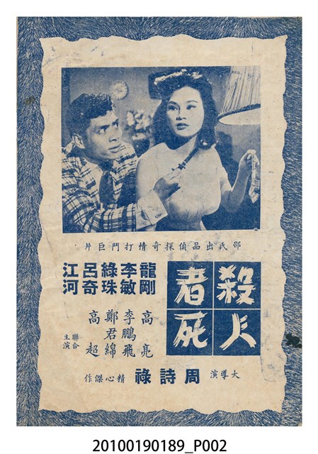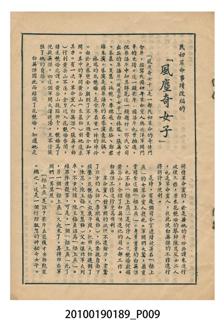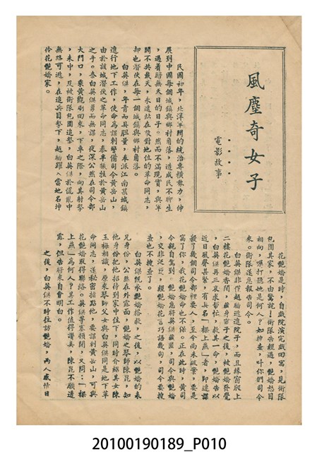 1. 香港粵語片《風塵奇女子》等片宣傳小冊,封面由劇照和彩色插圖構成,並標明「風塵奇女子」、主演演員等字樣,封底則為《黑夜鎗聲》(1960)的廣告,內頁包括《風塵奇女子》的介紹、電影故事、曲詞、演員表、演員林鳳、越南語介紹,以及《殺人者死》(1960)的全版廣告。2. 《風塵奇女子》為1960年由邵氏兄弟有限公司出品,袁秋楓導演,林鳳、張英才、麥基、夏慧、林艷、李鵬飛等人主演的香港粵語片,描述白英傑刺殺司令黃岳山失敗,為伶人花艷嬌所救,其琴師陳昆同為革命志士,請花艷嬌找機會幫助他接近黃岳山。革命份子樑上燕四處起事,令黃岳山束手無策。大帥親自南下鎮壓,黃岳山恐被降罪,遂求花艷嬌施展美人計,花艷嬌也順水推舟,為白英傑謀得司令部工作。白英傑每天為陳昆及其女玉梅提供情報,成功炸燬軍火,陳昆父女被捕,玉梅更自認為樑上燕。黃岳山見樑上燕已伏法,死花艷嬌隨大帥北上,即苦纏不休,花艷嬌卻上告大帥將他槍斃。白英傑恐身份洩露,找花艷嬌辭行,始知花艷嬌才是樑上燕,遂與她挾持大帥,劫獄後一起逃走。